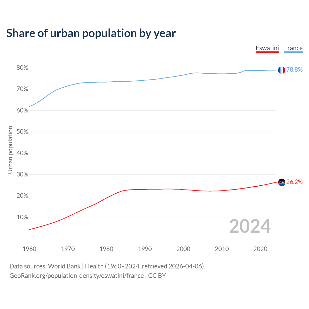 From 2004 to 2024, the share of urban population changed from 22.3% to 26.2% in Eswatini and from 77.5% to 78.8% in France.