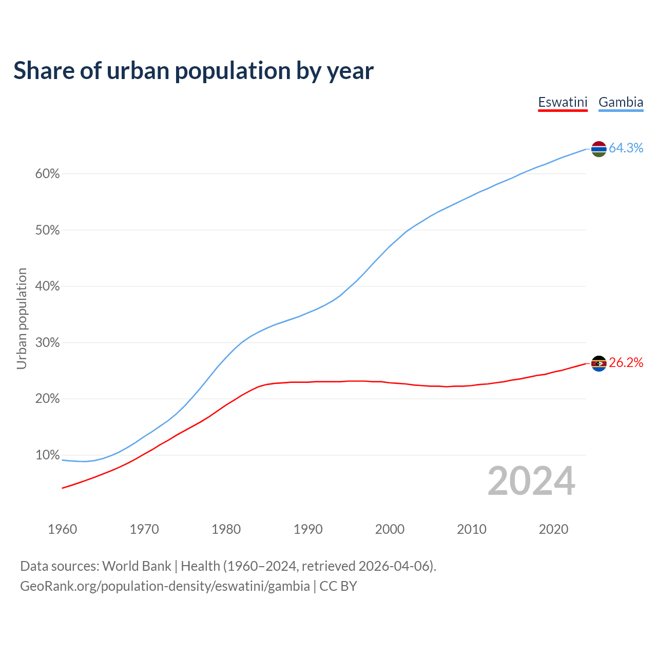 From 2004 to 2024, the share of urban population changed from 22.3% to 26.2% in Eswatini and from 51.5% to 64.3% in the Gambia.