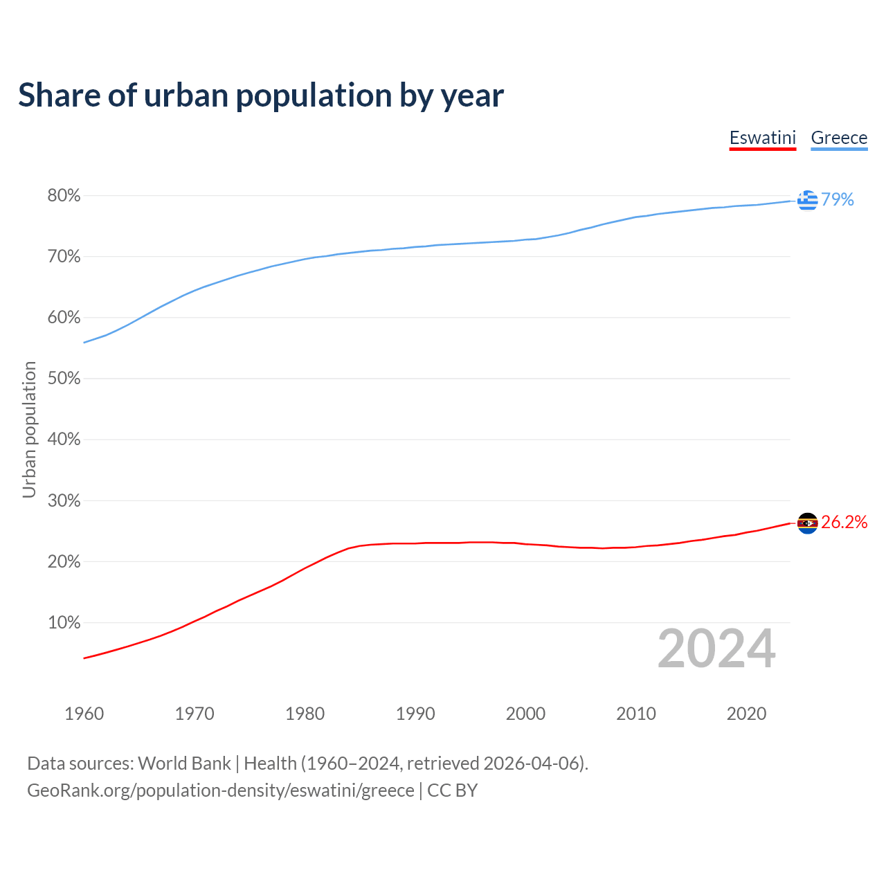 From 2004 to 2024, the share of urban population changed from 22.3% to 26.2% in Eswatini and from 73.8% to 79% in Greece.