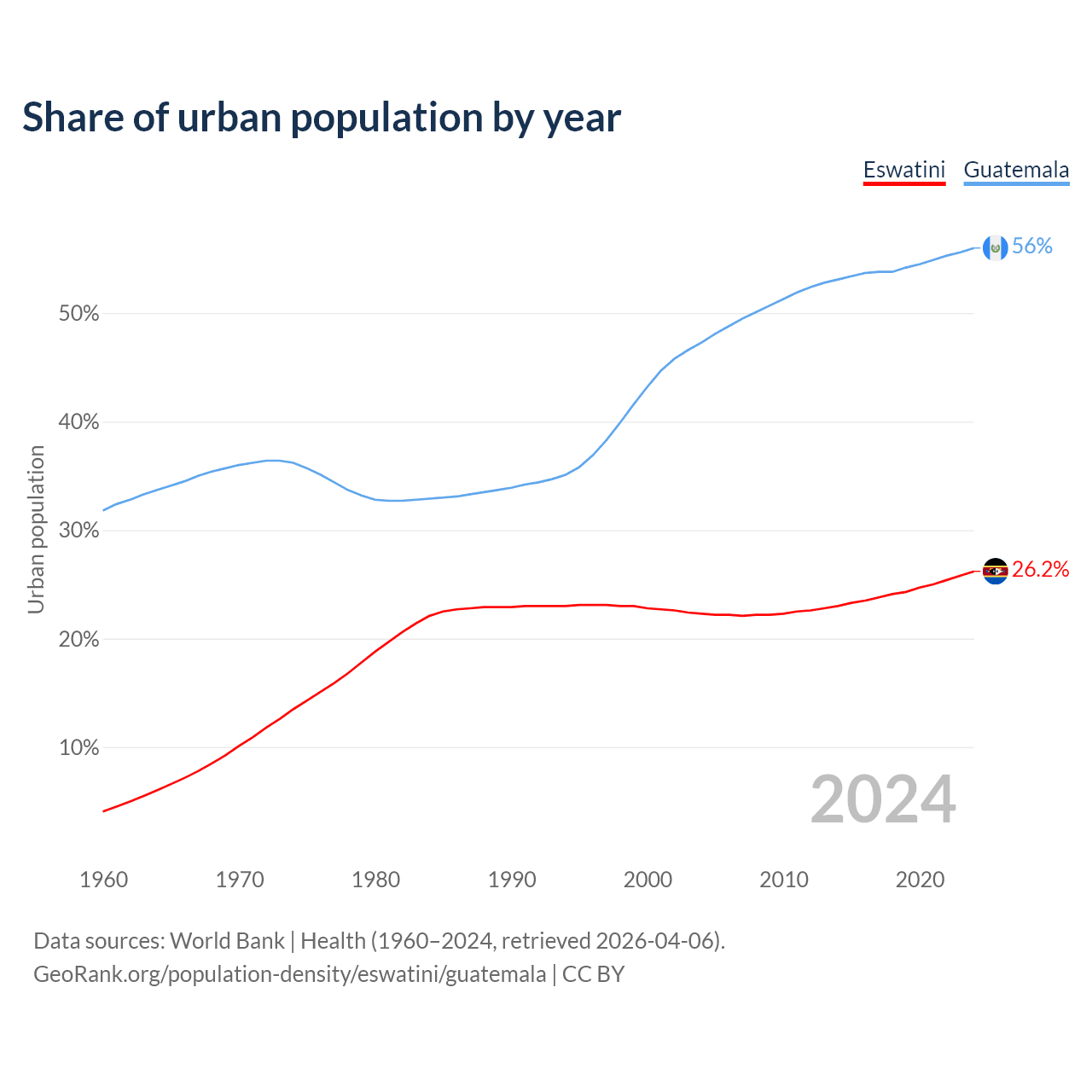 From 2004 to 2024, the share of urban population changed from 22.3% to 26.2% in Eswatini and from 47.3% to 56% in Guatemala.