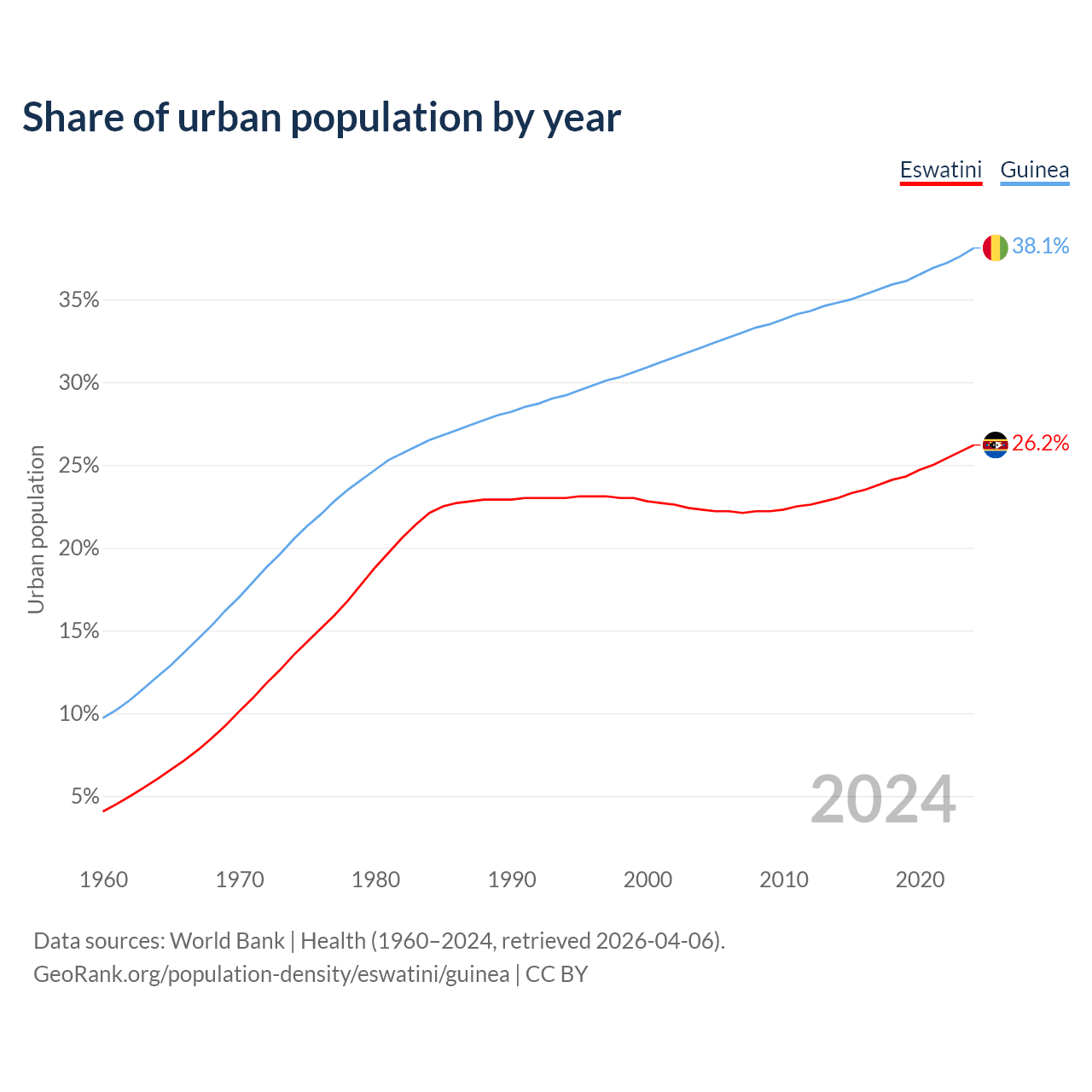 From 2004 to 2024, the share of urban population changed from 22.3% to 26.2% in Eswatini and from 32.1% to 38.1% in Guinea.
