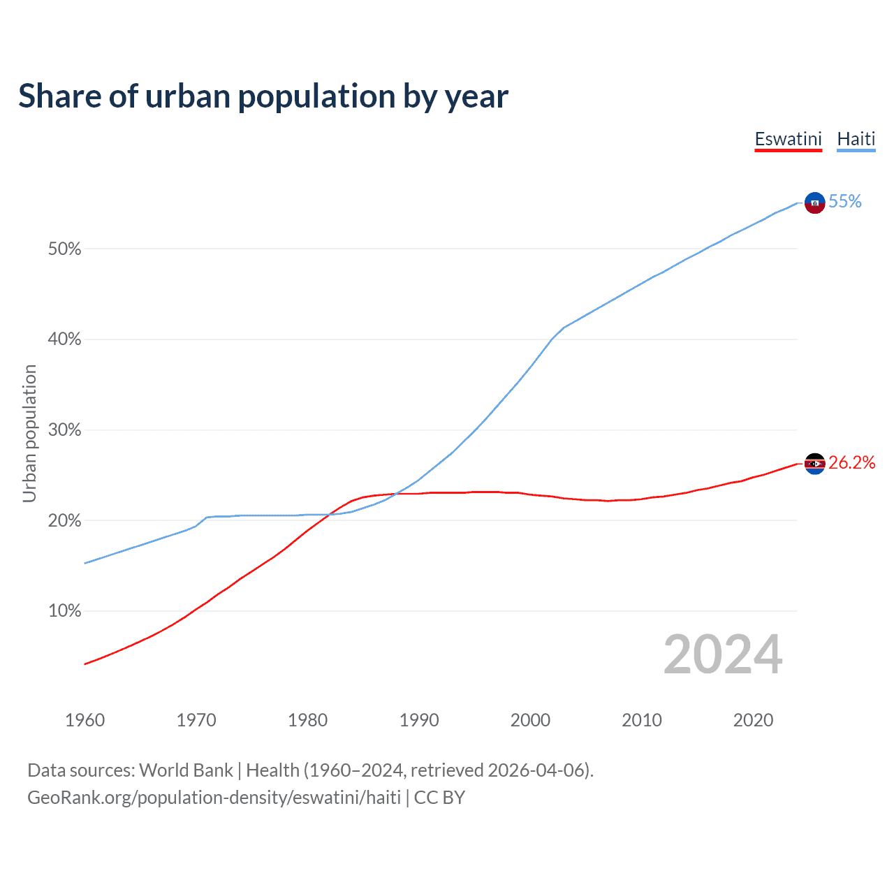 From 2004 to 2024, the share of urban population changed from 22.3% to 26.2% in Eswatini and from 41.9% to 55% in Haiti.