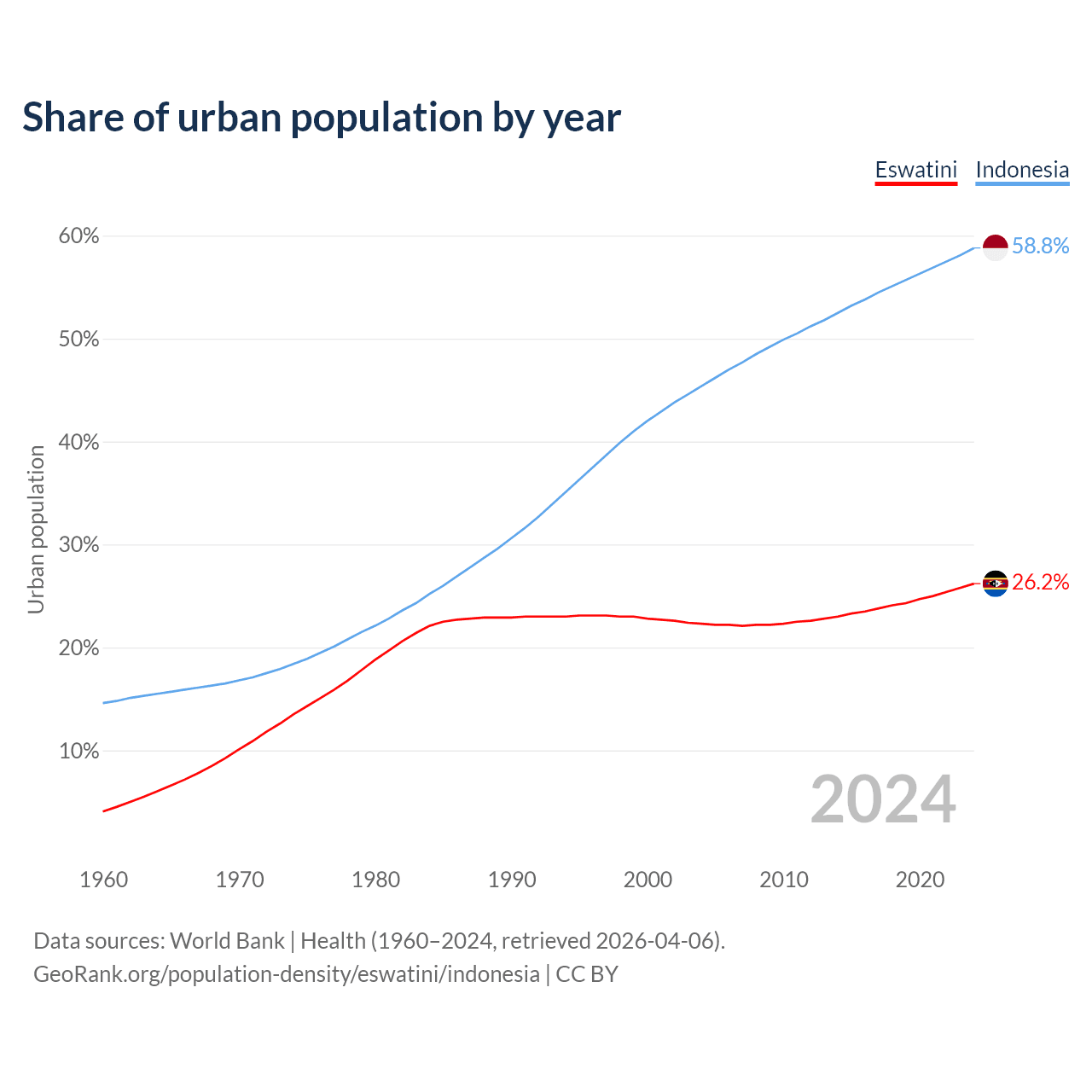 From 2004 to 2024, the share of urban population changed from 22.3% to 26.2% in Eswatini and from 45.4% to 58.8% in Indonesia.