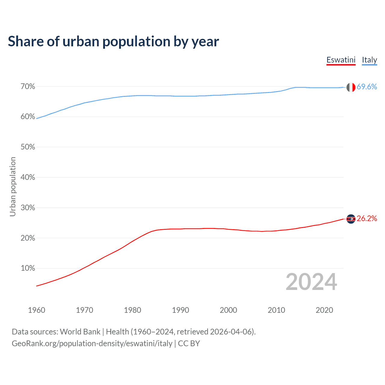 From 2004 to 2024, the share of urban population changed from 22.3% to 26.2% in Eswatini and from 67.5% to 69.6% in Italy.