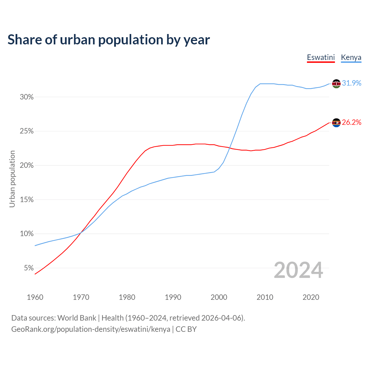 From 2004 to 2024, the share of urban population changed from 22.3% to 26.2% in Eswatini and from 25.4% to 31.9% in Kenya.