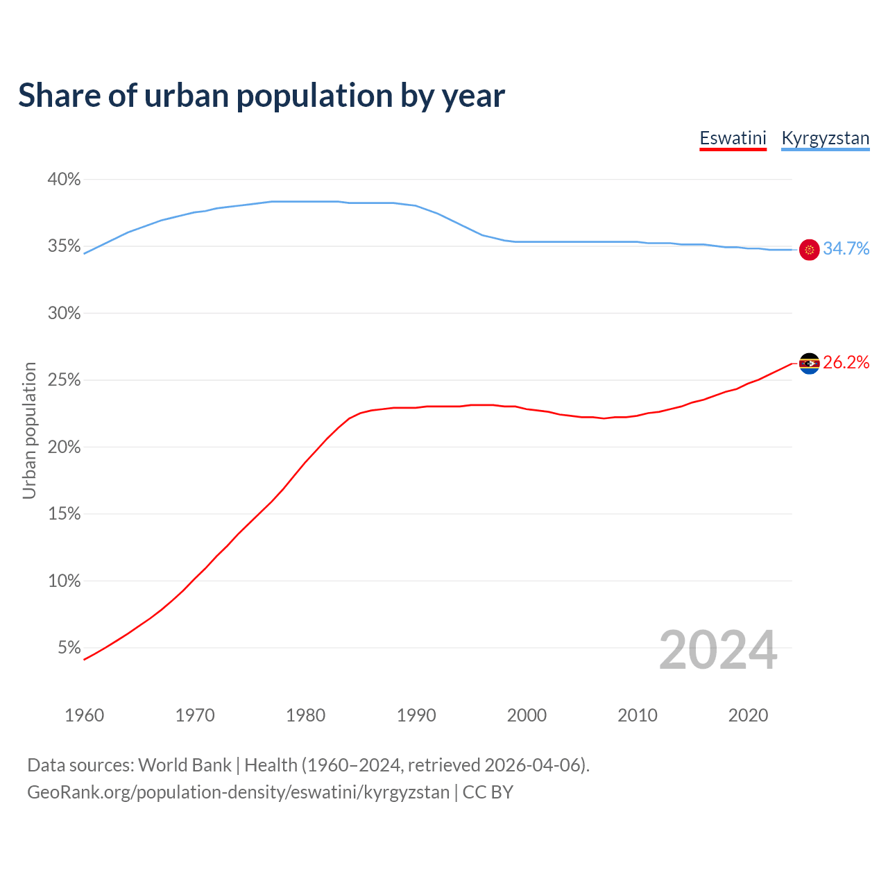 From 2004 to 2024, the share of urban population changed from 22.3% to 26.2% in Eswatini and from 35.3% to 34.7% in Kyrgyzstan.