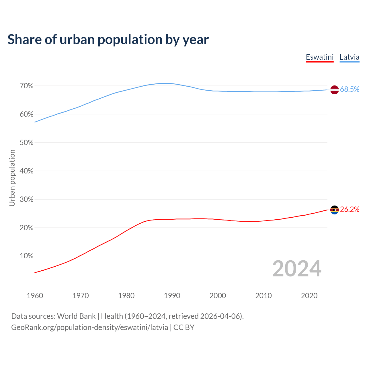 From 2004 to 2024, the share of urban population changed from 22.3% to 26.2% in Eswatini and from 67.9% to 68.5% in Latvia.