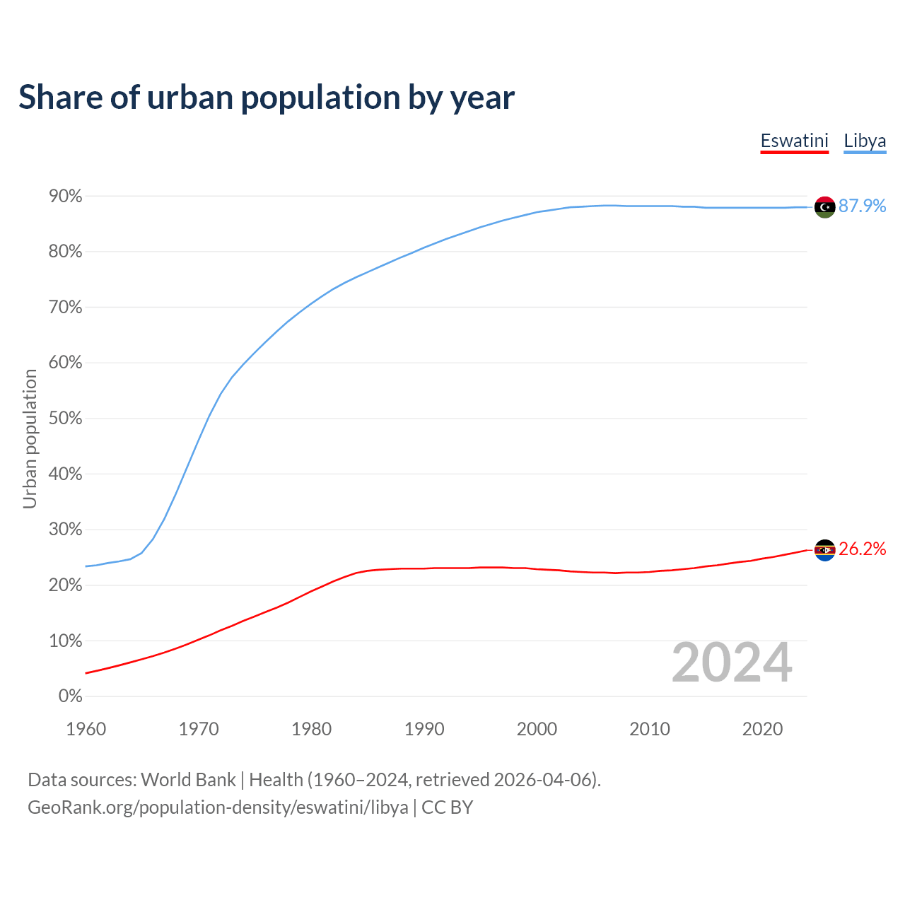 From 2004 to 2024, the share of urban population changed from 22.3% to 26.2% in Eswatini and from 88% to 87.9% in Libya.
