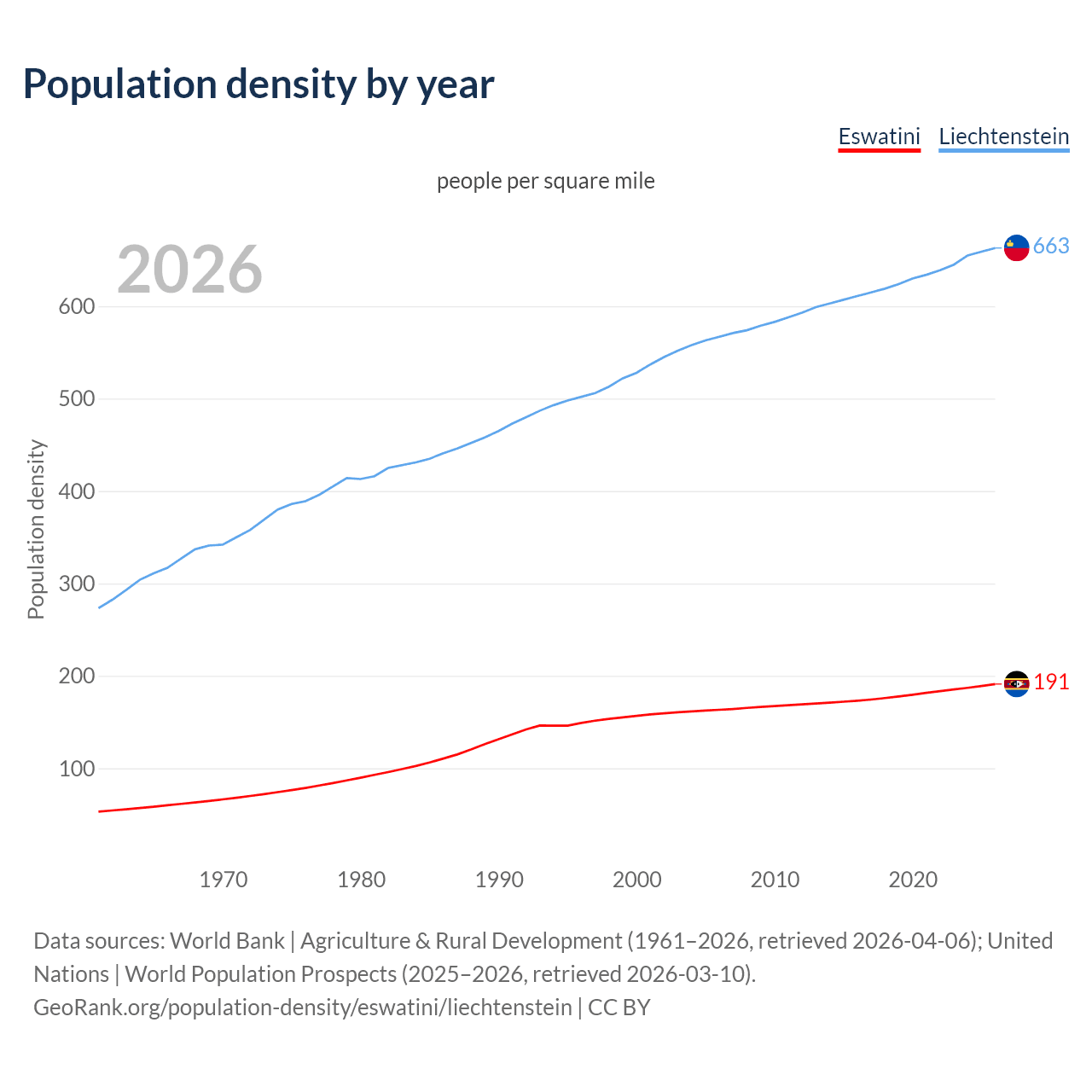 From 2006 to 2026, population density in Eswatini increased by 17.1%, compared to a 16.9% growth in Liechtenstein.