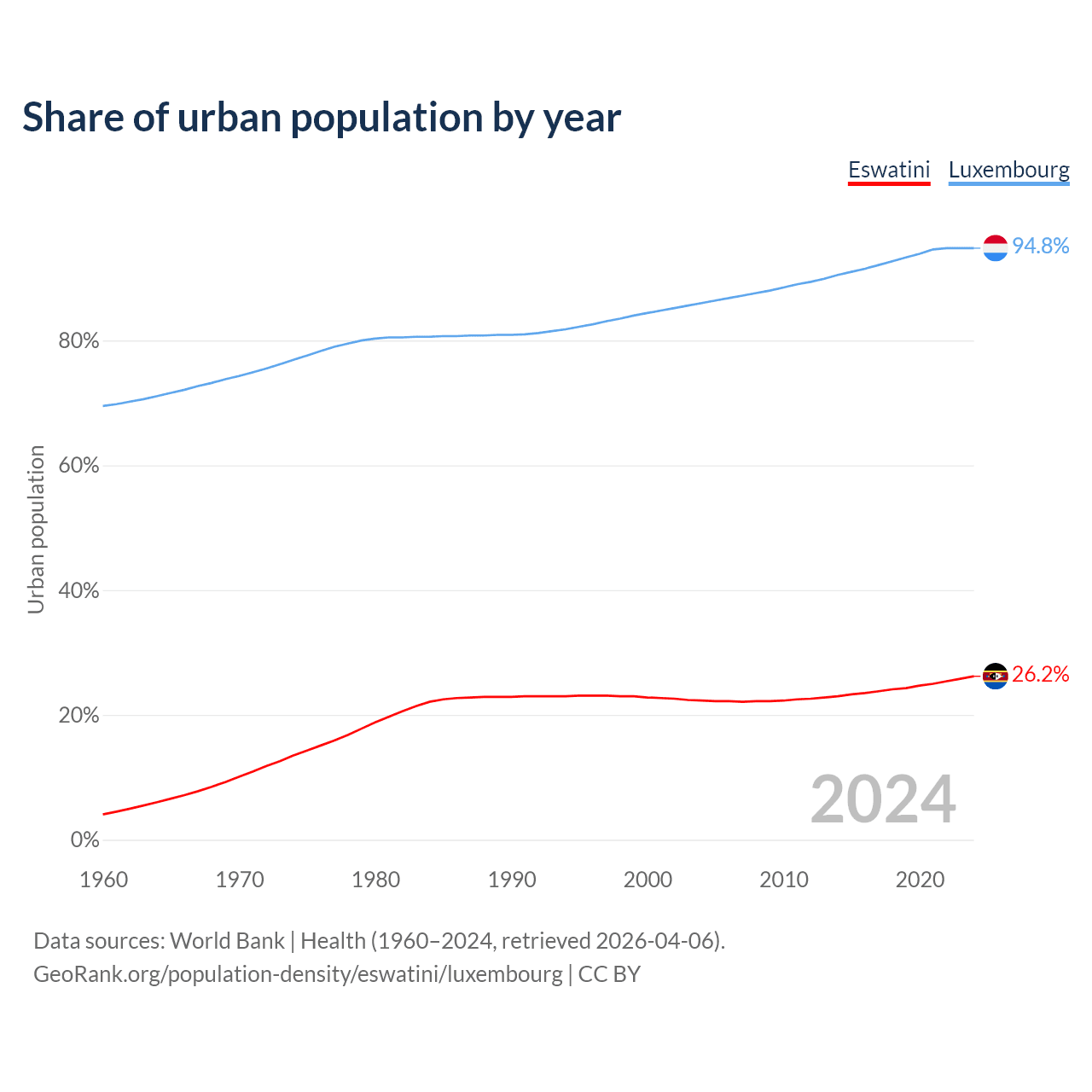 From 2004 to 2024, the share of urban population changed from 22.3% to 26.2% in Eswatini and from 86% to 94.8% in Luxembourg.