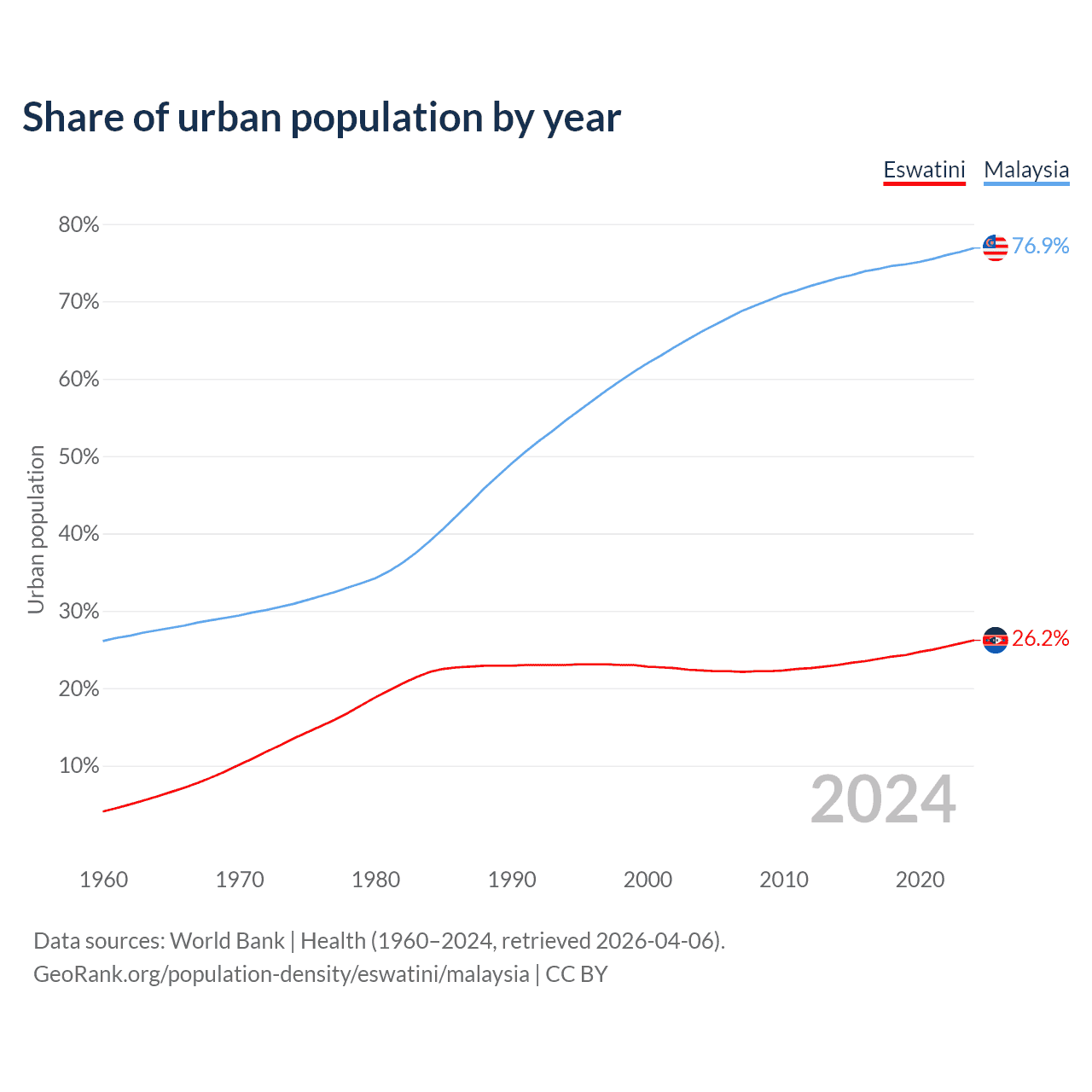 From 2004 to 2024, the share of urban population changed from 22.3% to 26.2% in Eswatini and from 66.1% to 76.9% in Malaysia.