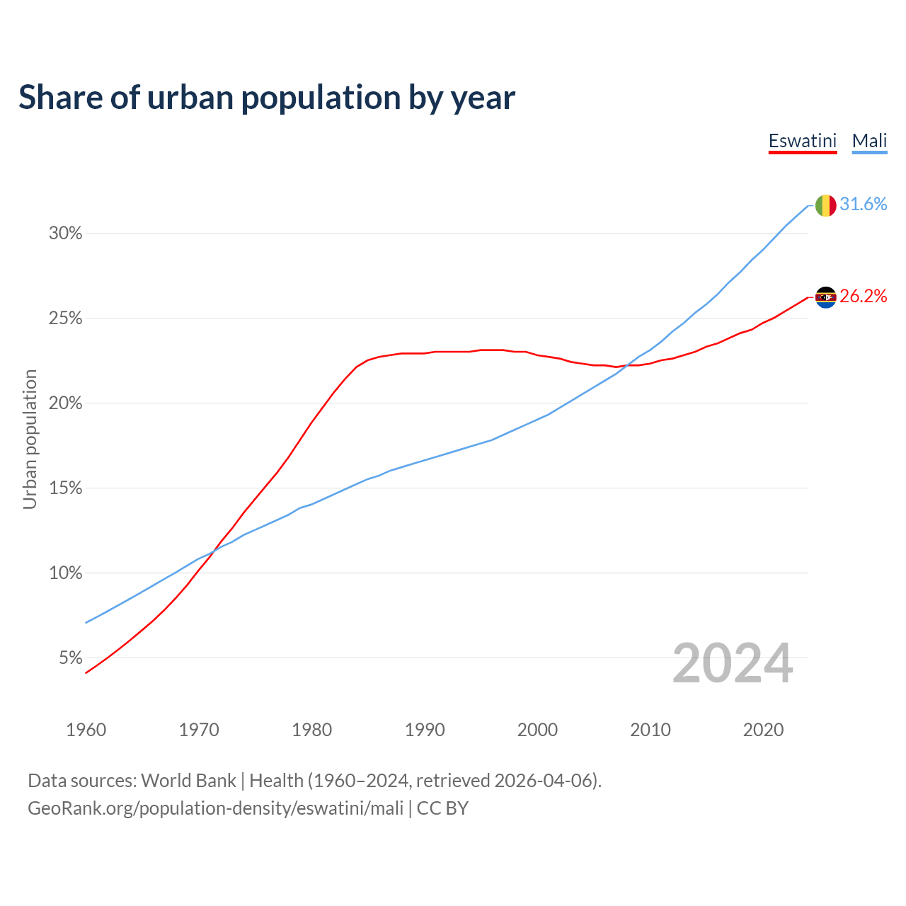 From 2004 to 2024, the share of urban population changed from 22.3% to 26.2% in Eswatini and from 20.5% to 31.6% in Mali.
