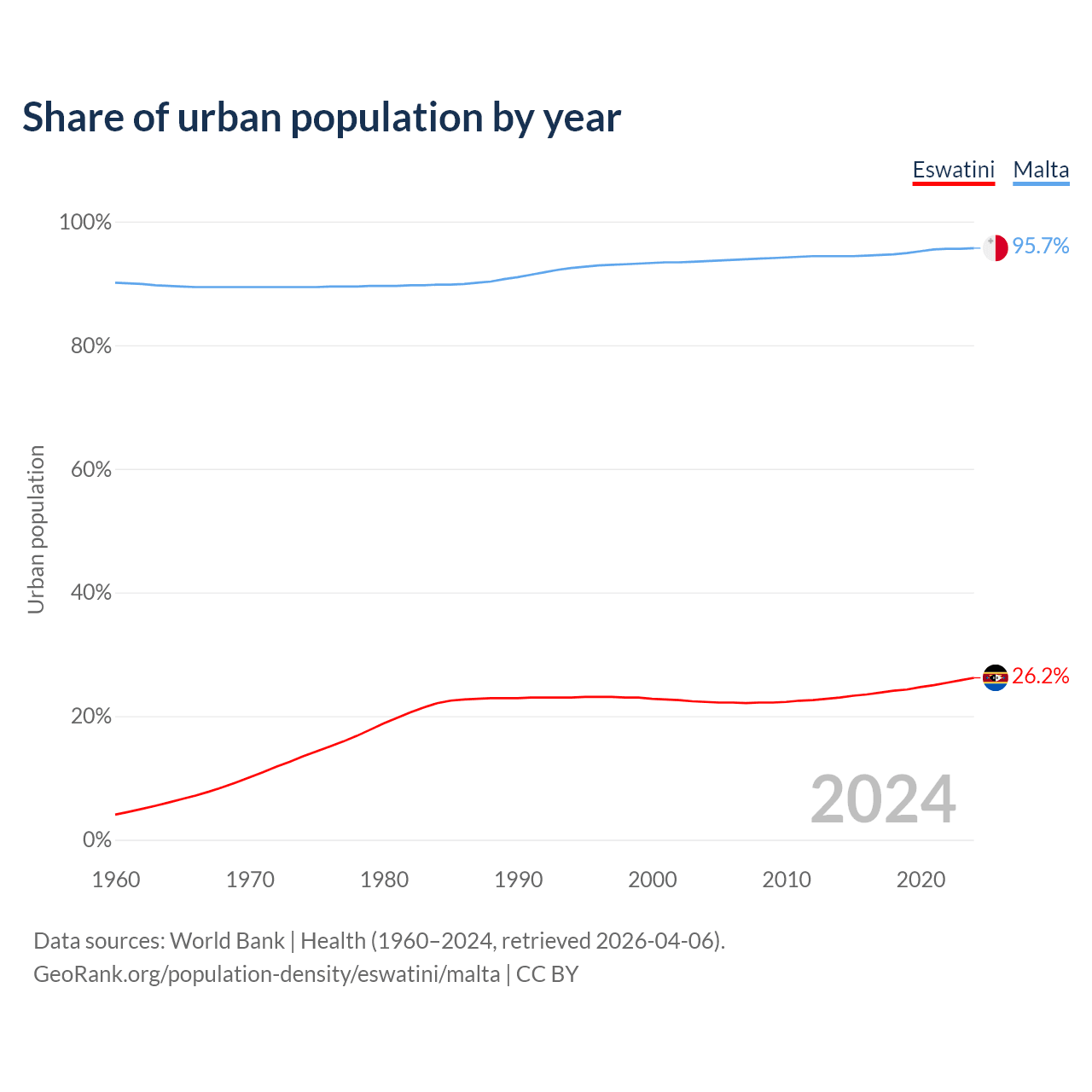 From 2004 to 2024, the share of urban population changed from 22.3% to 26.2% in Eswatini and from 93.6% to 95.7% in Malta.