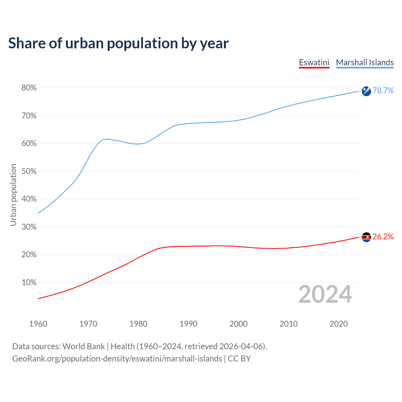 From 2004 to 2024, the share of urban population changed from 22.3% to 26.2% in Eswatini and from 70.1% to 78.7% in the Marshall Islands.