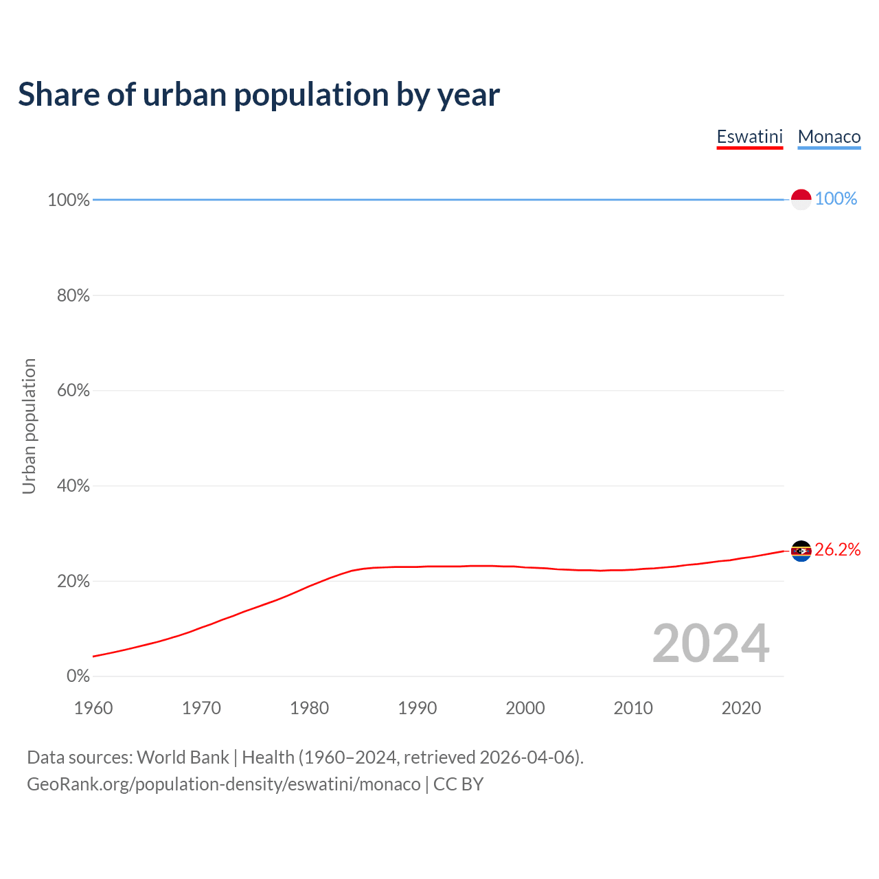 From 2004 to 2024, the share of urban population changed from 22.3% to 26.2% in Eswatini and from 100% to 100% in Monaco.