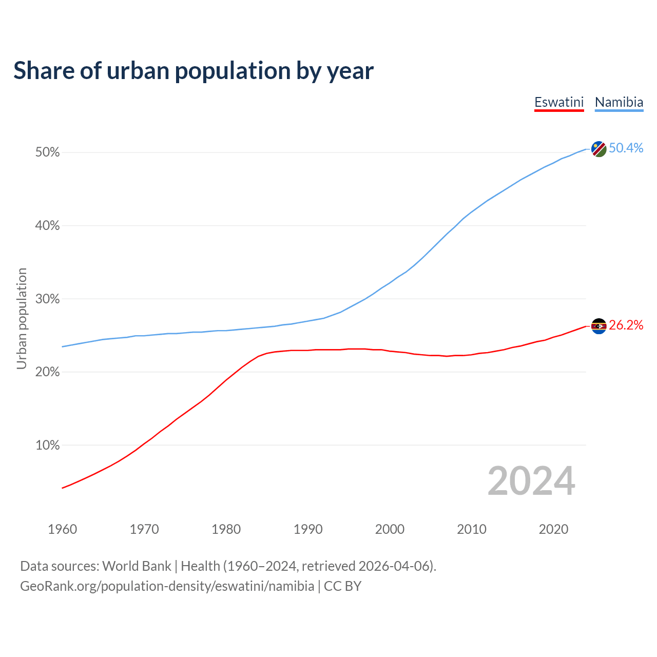 From 2004 to 2024, the share of urban population changed from 22.3% to 26.2% in Eswatini and from 35.5% to 50.4% in Namibia.