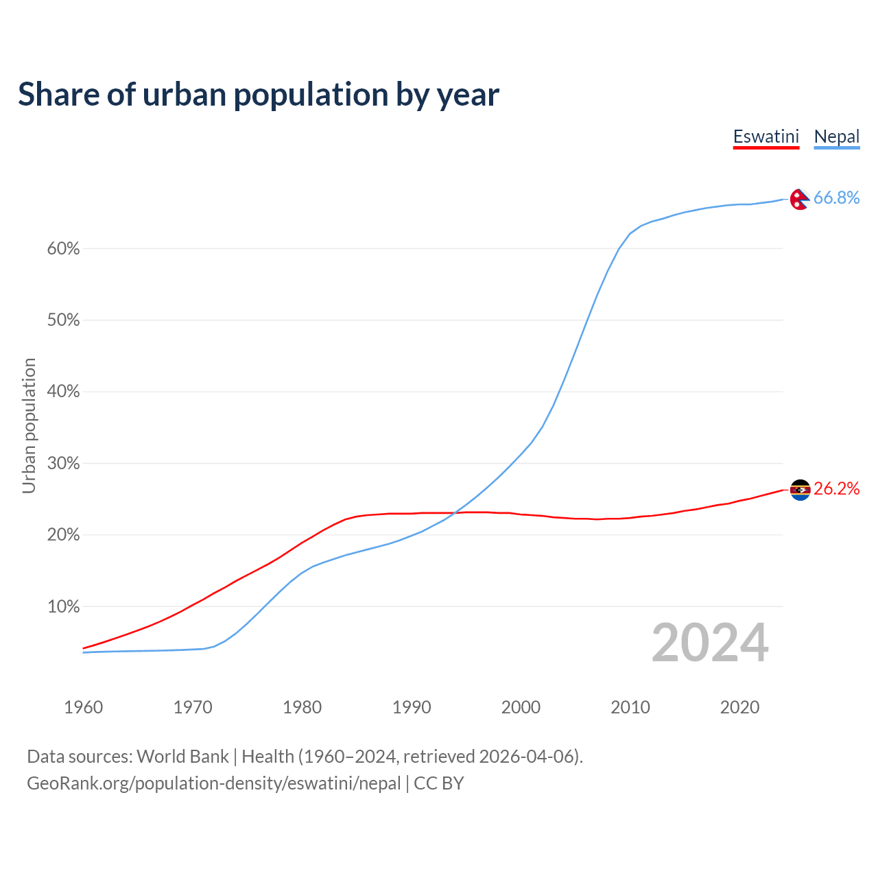 From 2004 to 2024, the share of urban population changed from 22.3% to 26.2% in Eswatini and from 41.6% to 66.8% in Nepal.