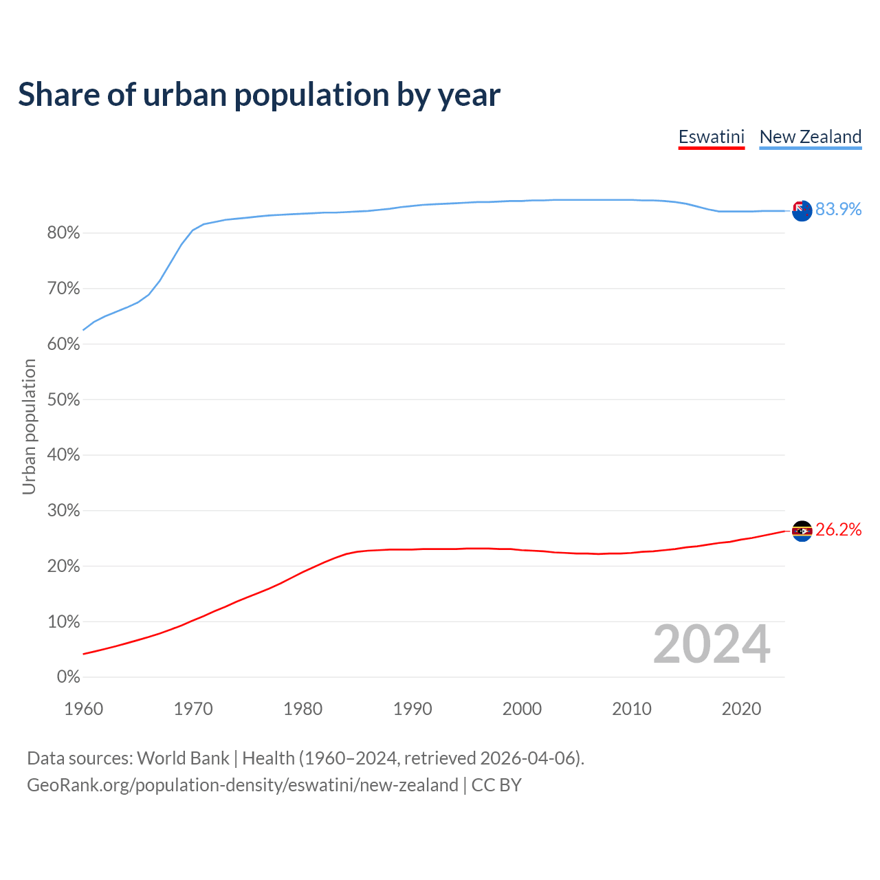 From 2004 to 2024, the share of urban population changed from 22.3% to 26.2% in Eswatini and from 85.9% to 83.9% in New Zealand.