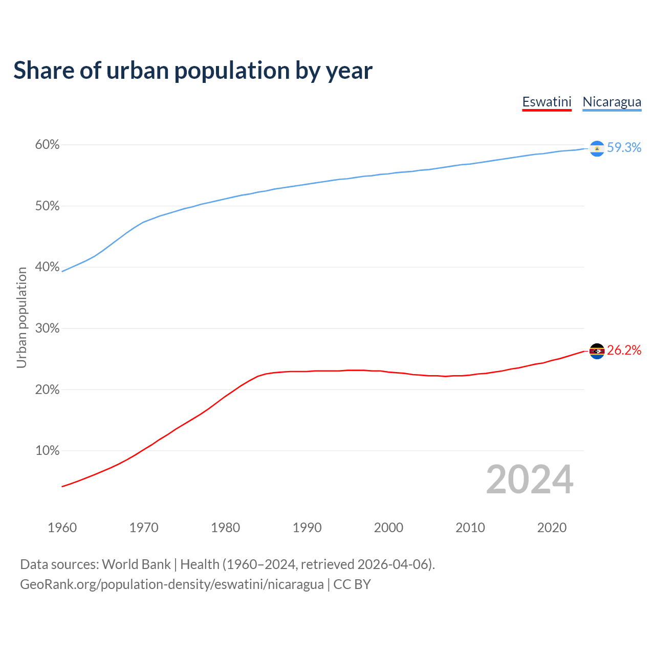 From 2004 to 2024, the share of urban population changed from 22.3% to 26.2% in Eswatini and from 55.8% to 59.3% in Nicaragua.