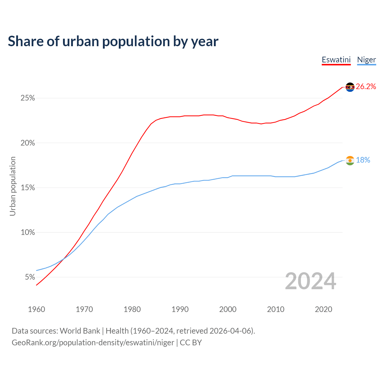 From 2004 to 2024, the share of urban population changed from 22.3% to 26.2% in Eswatini and from 16.3% to 18% in Niger.