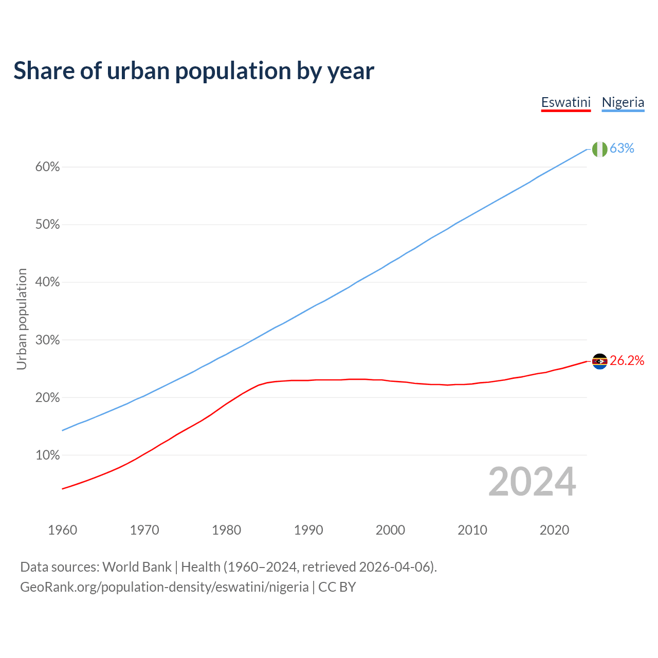 From 2004 to 2024, the share of urban population changed from 22.3% to 26.2% in Eswatini and from 46.7% to 63% in Nigeria.