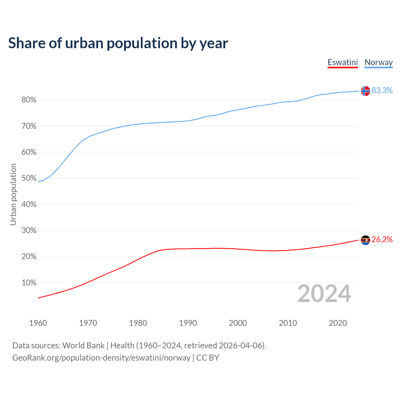 From 2004 to 2024, the share of urban population changed from 22.3% to 26.2% in Eswatini and from 77.6% to 83.3% in Norway.