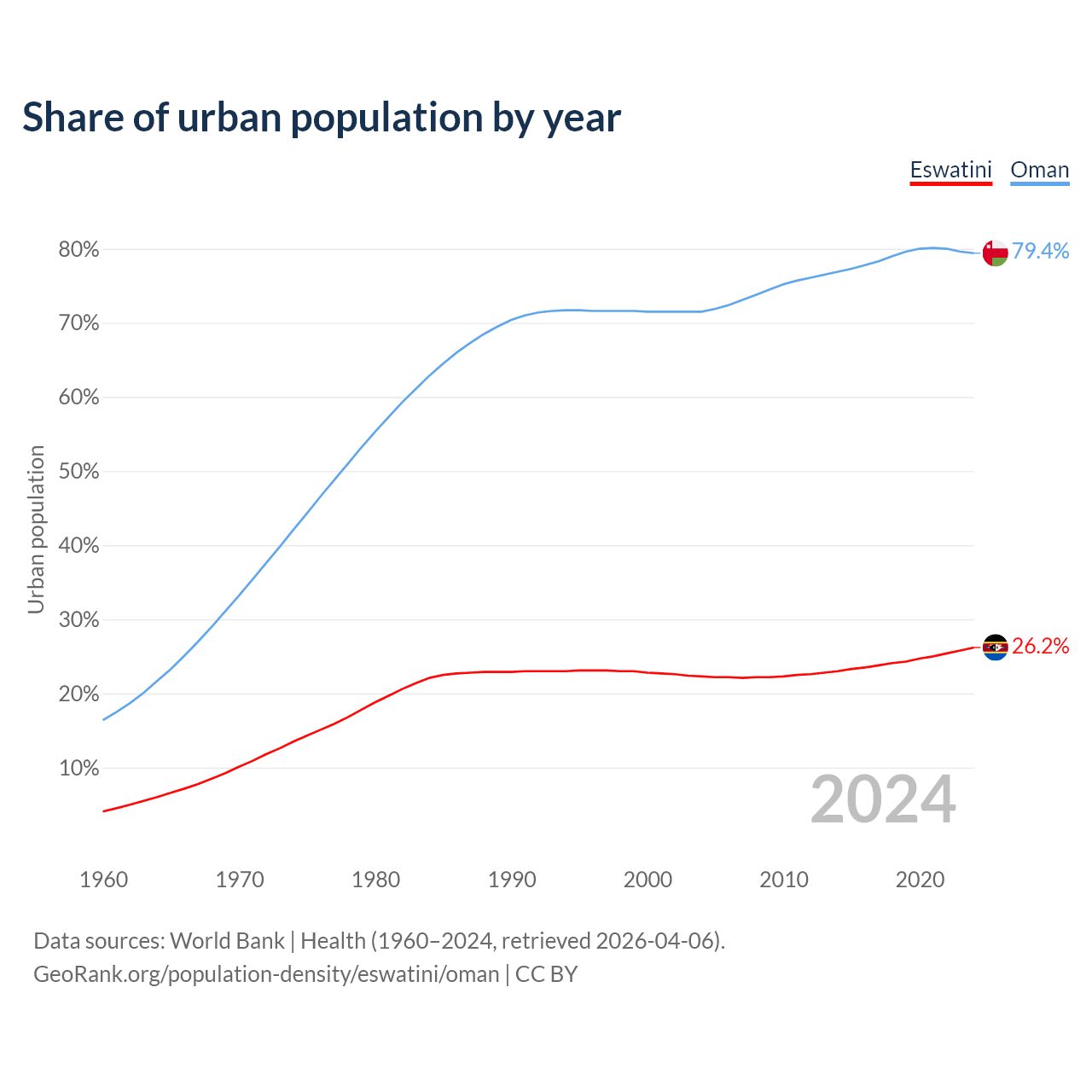 From 2004 to 2024, the share of urban population changed from 22.3% to 26.2% in Eswatini and from 71.5% to 79.4% in Oman.