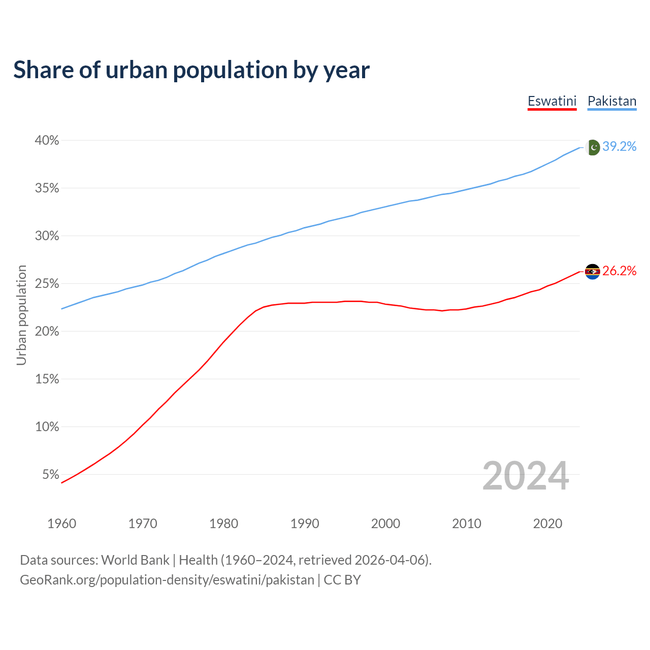 From 2004 to 2024, the share of urban population changed from 22.3% to 26.2% in Eswatini and from 33.7% to 39.2% in Pakistan.