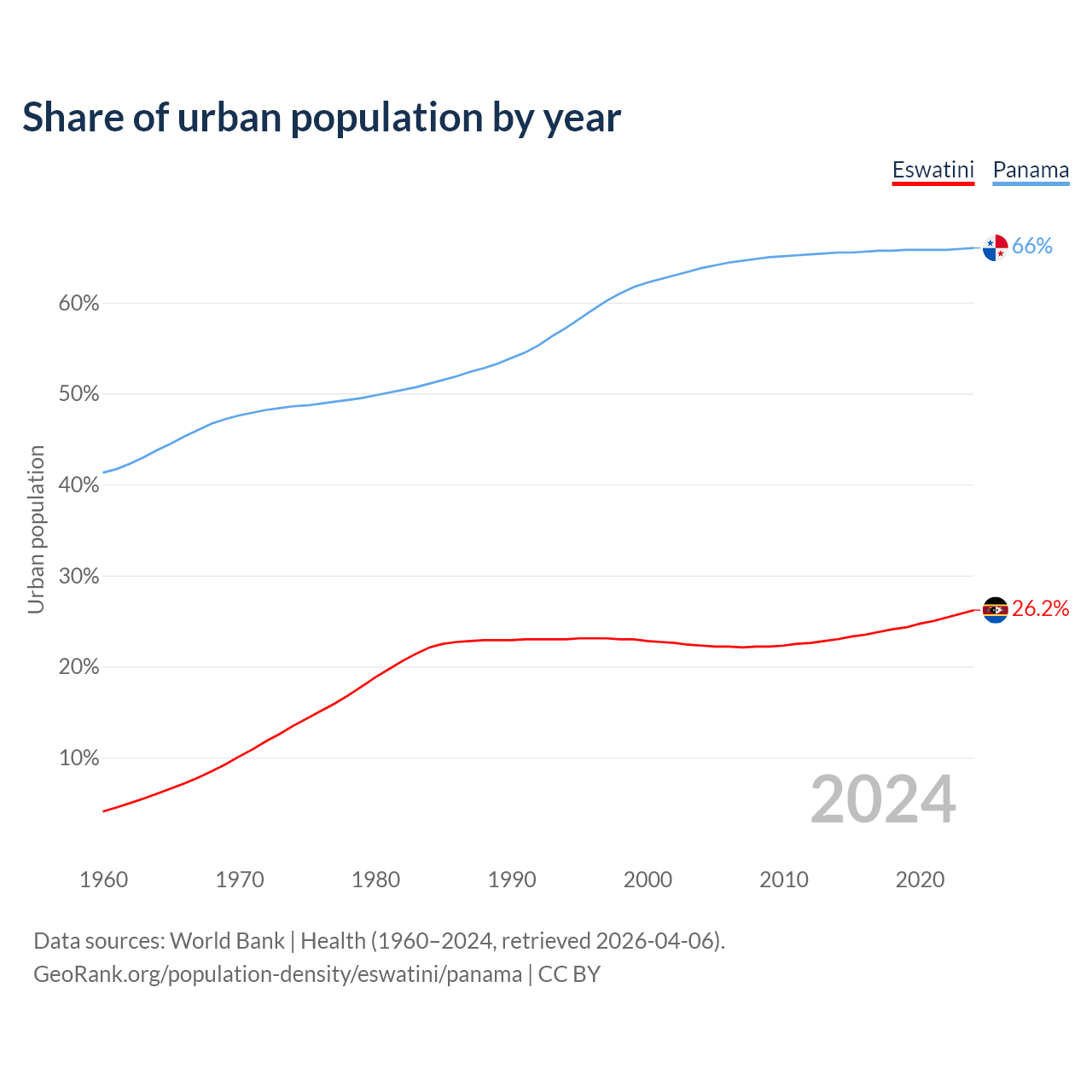 From 2004 to 2024, the share of urban population changed from 22.3% to 26.2% in Eswatini and from 63.8% to 66% in Panama.