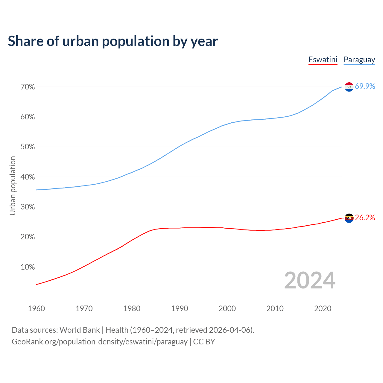 From 2004 to 2024, the share of urban population changed from 22.3% to 26.2% in Eswatini and from 58.7% to 69.9% in Paraguay.