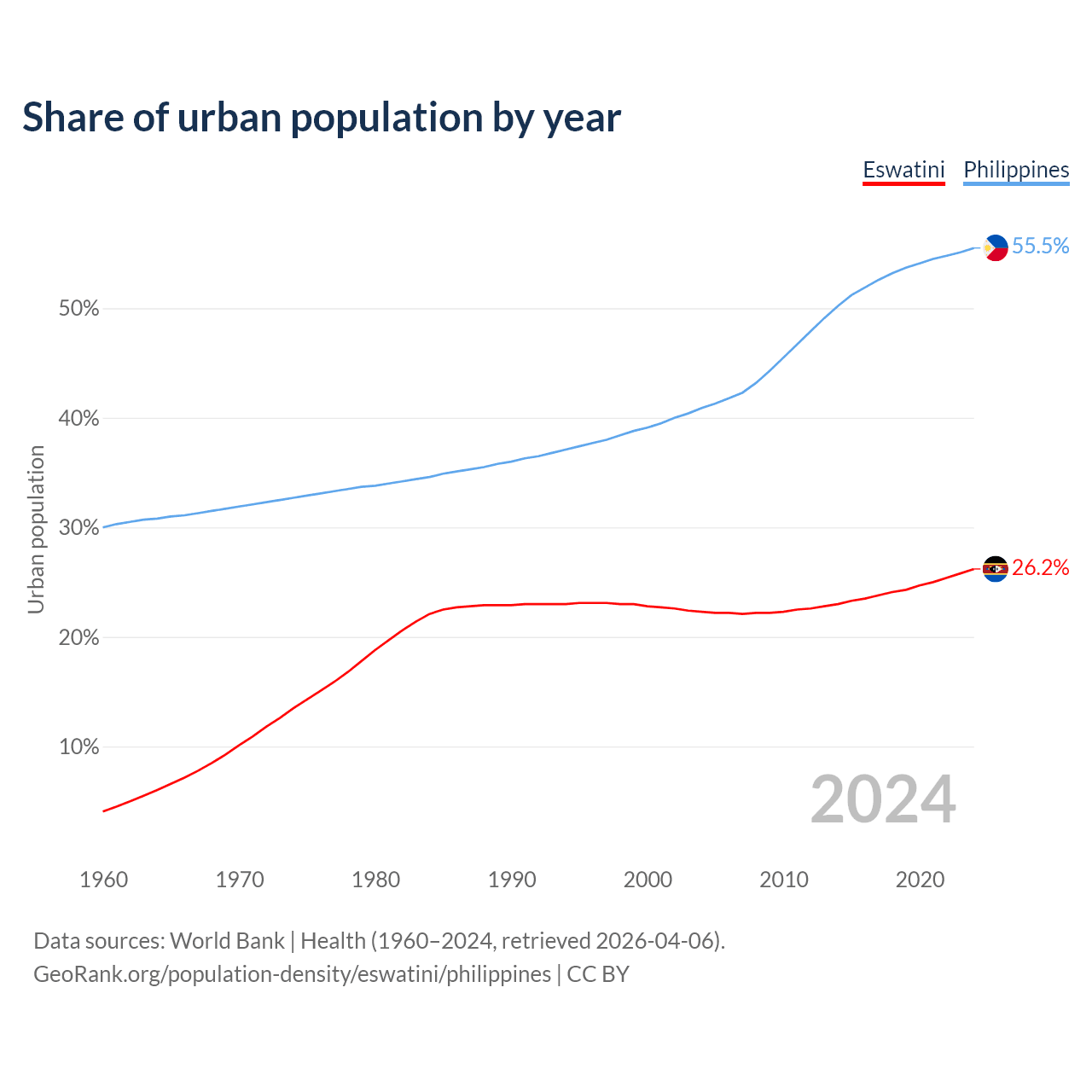 From 2004 to 2024, the share of urban population changed from 22.3% to 26.2% in Eswatini and from 40.9% to 55.5% in the Philippines.