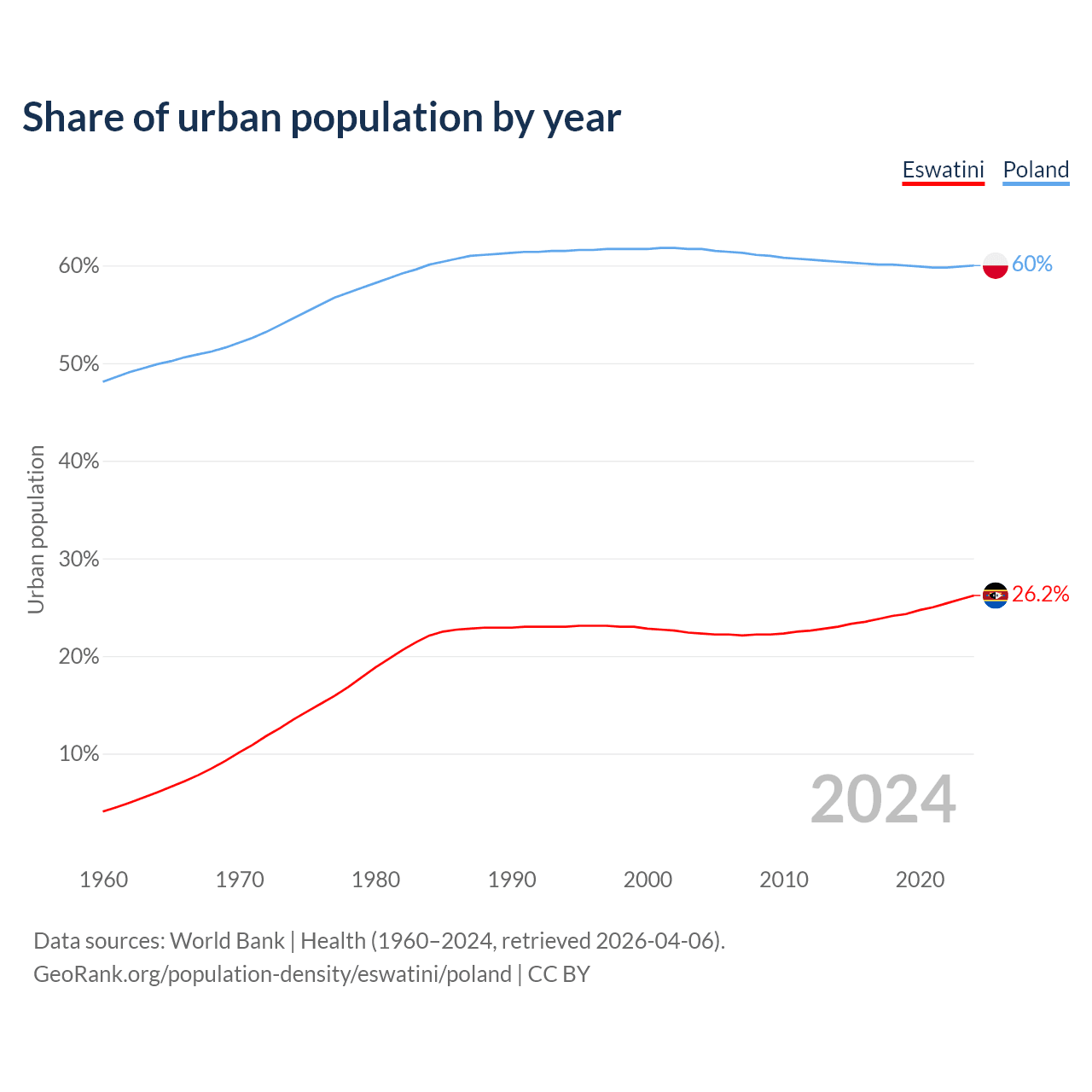 From 2004 to 2024, the share of urban population changed from 22.3% to 26.2% in Eswatini and from 61.7% to 60% in Poland.