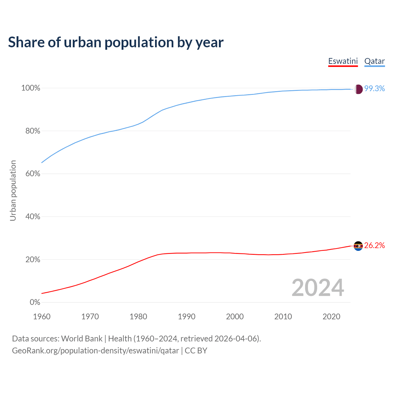 From 2004 to 2024, the share of urban population changed from 22.3% to 26.2% in Eswatini and from 97% to 99.3% in Qatar.