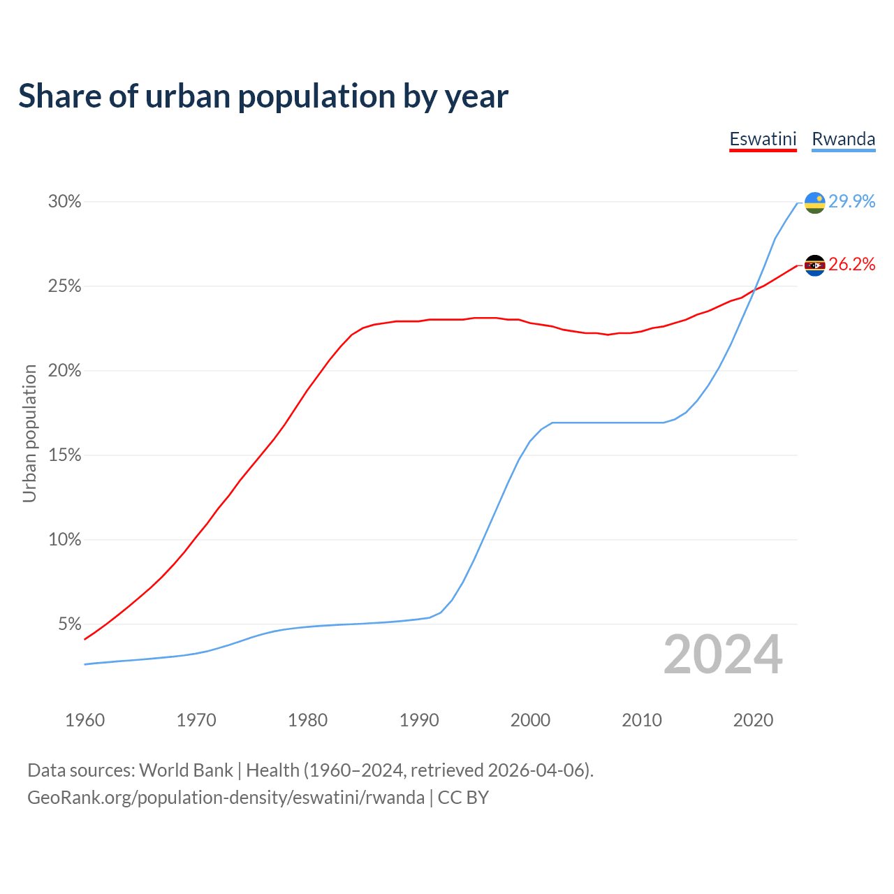 From 2006 to 2026, population density in Eswatini increased by 17.1%, compared to a 60.1% growth in Rwanda.