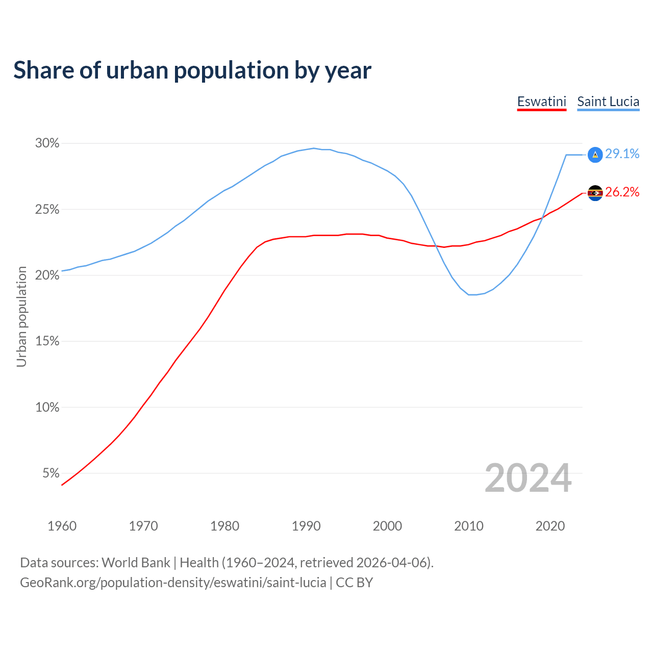 From 2004 to 2024, the share of urban population changed from 22.3% to 26.2% in Eswatini and from 24.8% to 29.1% in Saint Lucia.