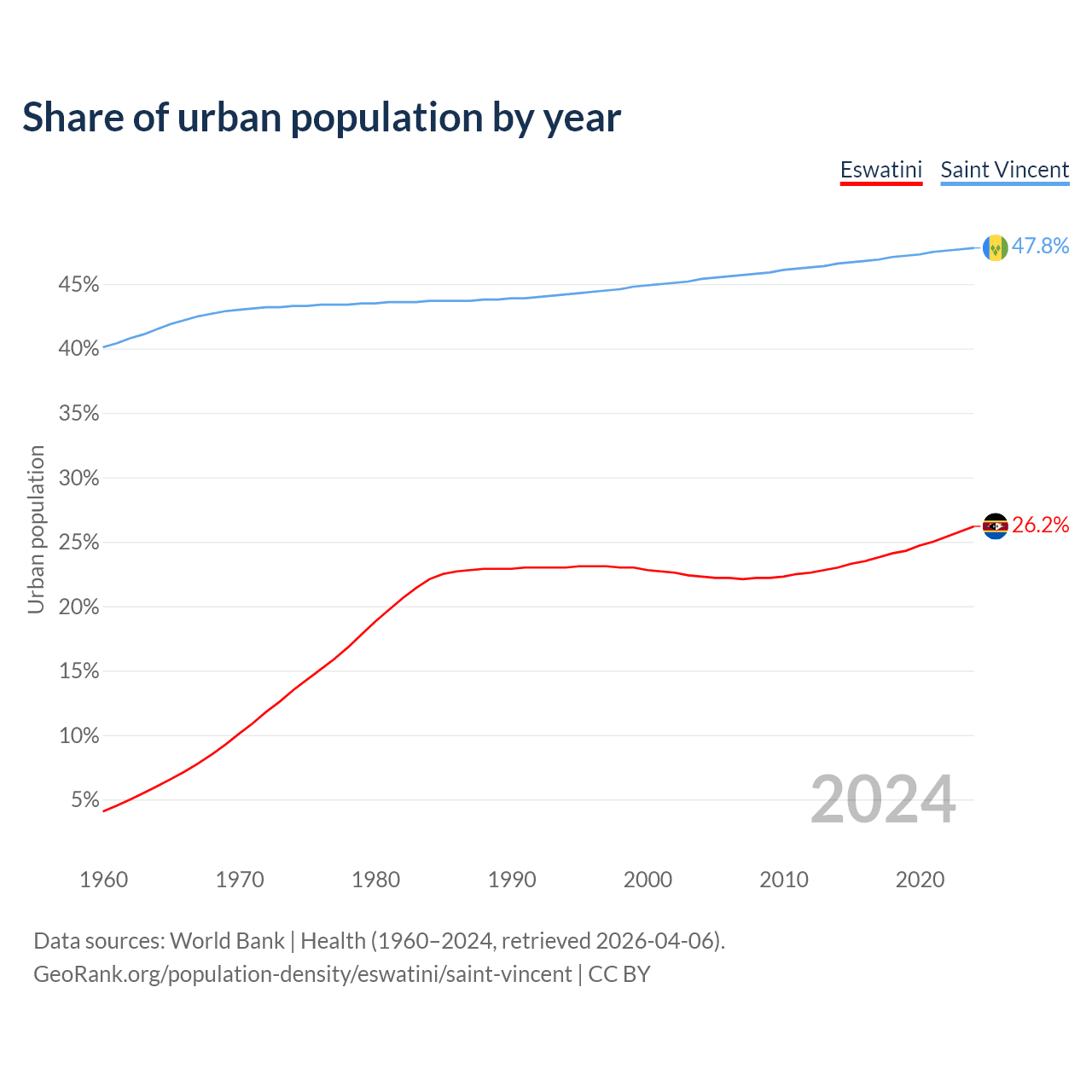 From 2004 to 2024, the share of urban population changed from 22.3% to 26.2% in Eswatini and from 45.4% to 47.8% in Saint Vincent.