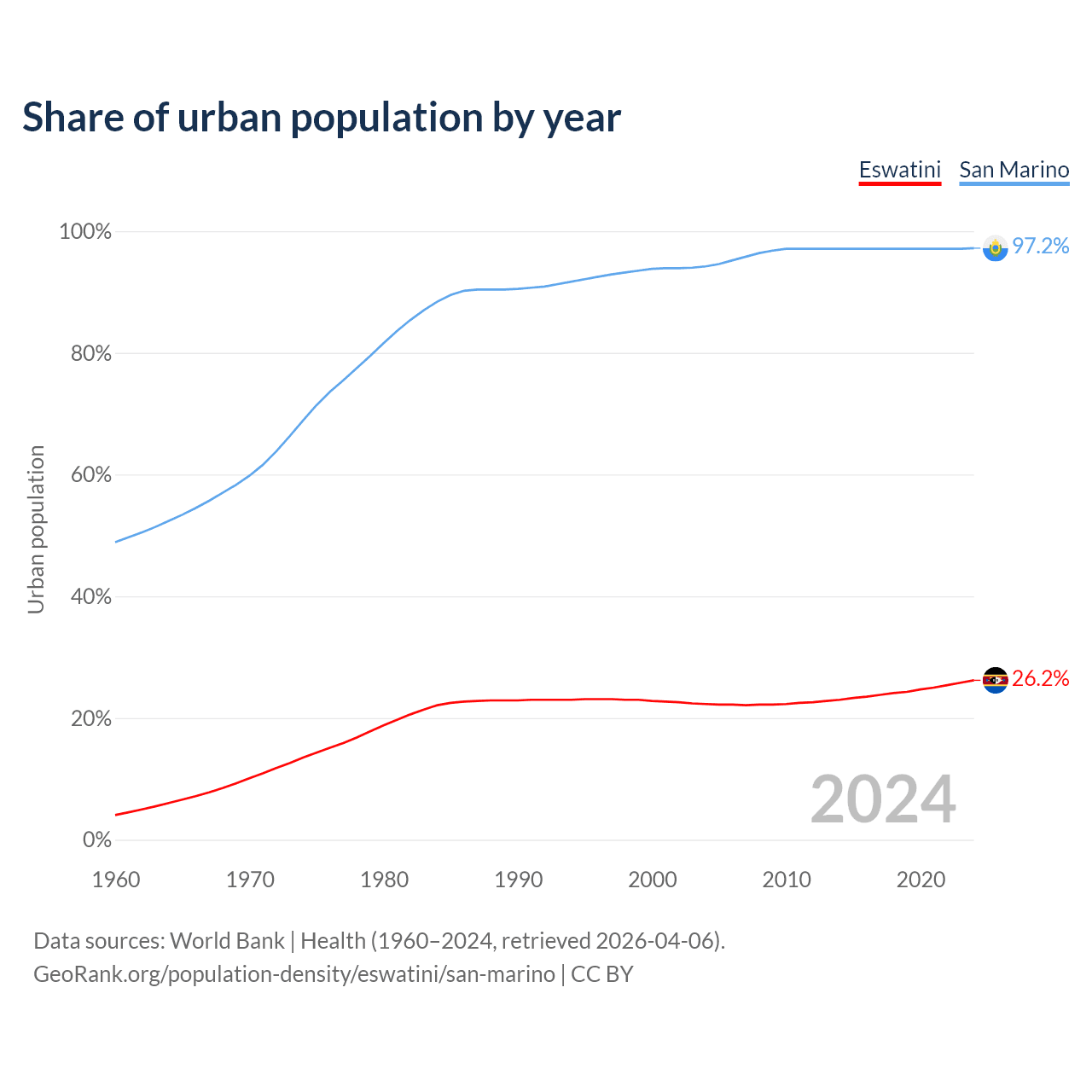 From 2004 to 2024, the share of urban population changed from 22.3% to 26.2% in Eswatini and from 94.2% to 97.2% in San Marino.