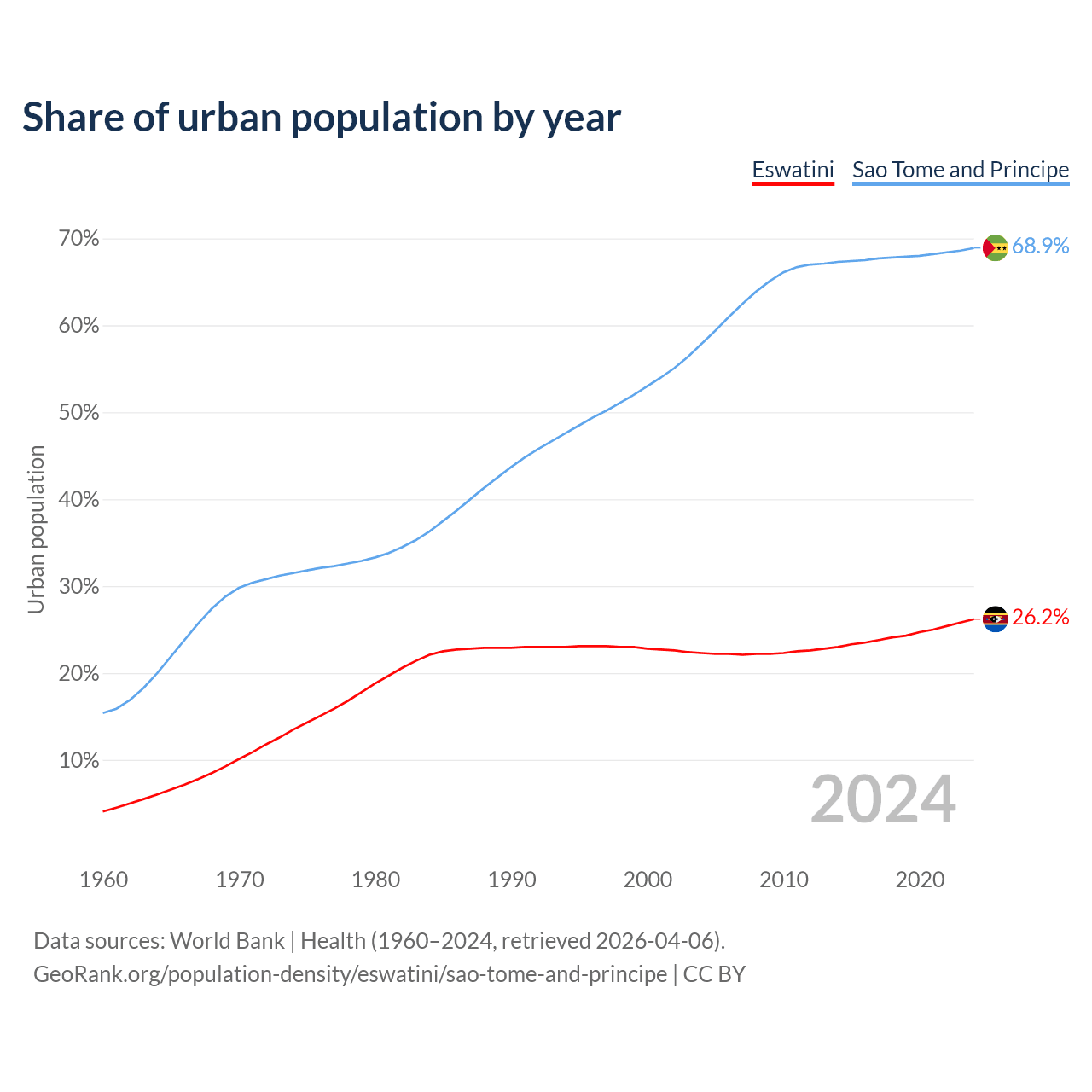 From 2004 to 2024, the share of urban population changed from 22.3% to 26.2% in Eswatini and from 57.9% to 68.9% in Sao Tome and Principe.