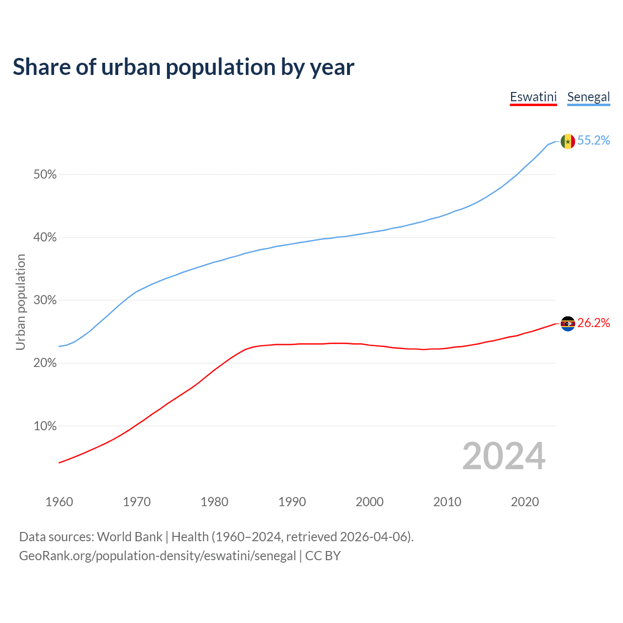 From 2004 to 2024, the share of urban population changed from 22.3% to 26.2% in Eswatini and from 41.6% to 55.2% in Senegal.