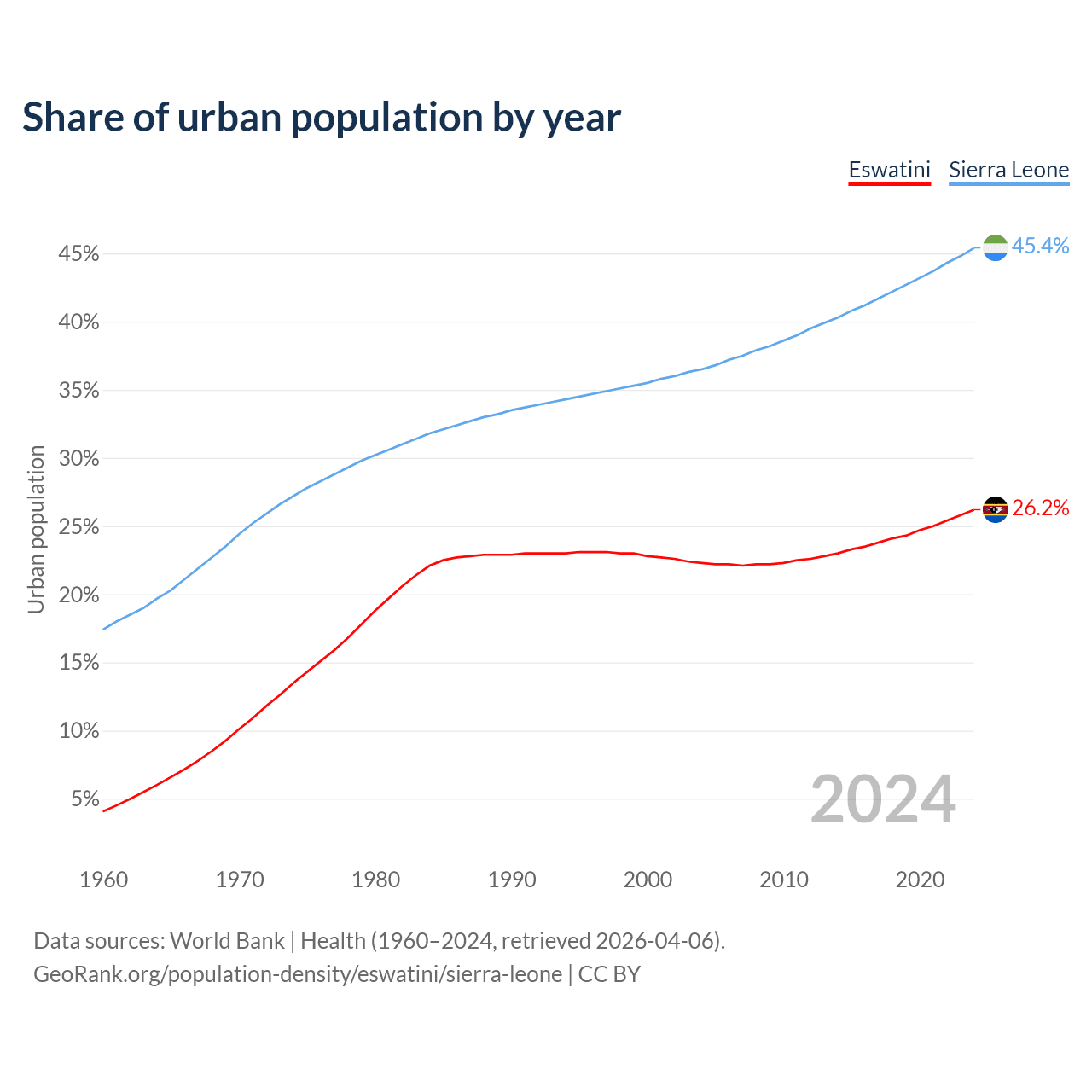 From 2004 to 2024, the share of urban population changed from 22.3% to 26.2% in Eswatini and from 36.5% to 45.4% in Sierra Leone.