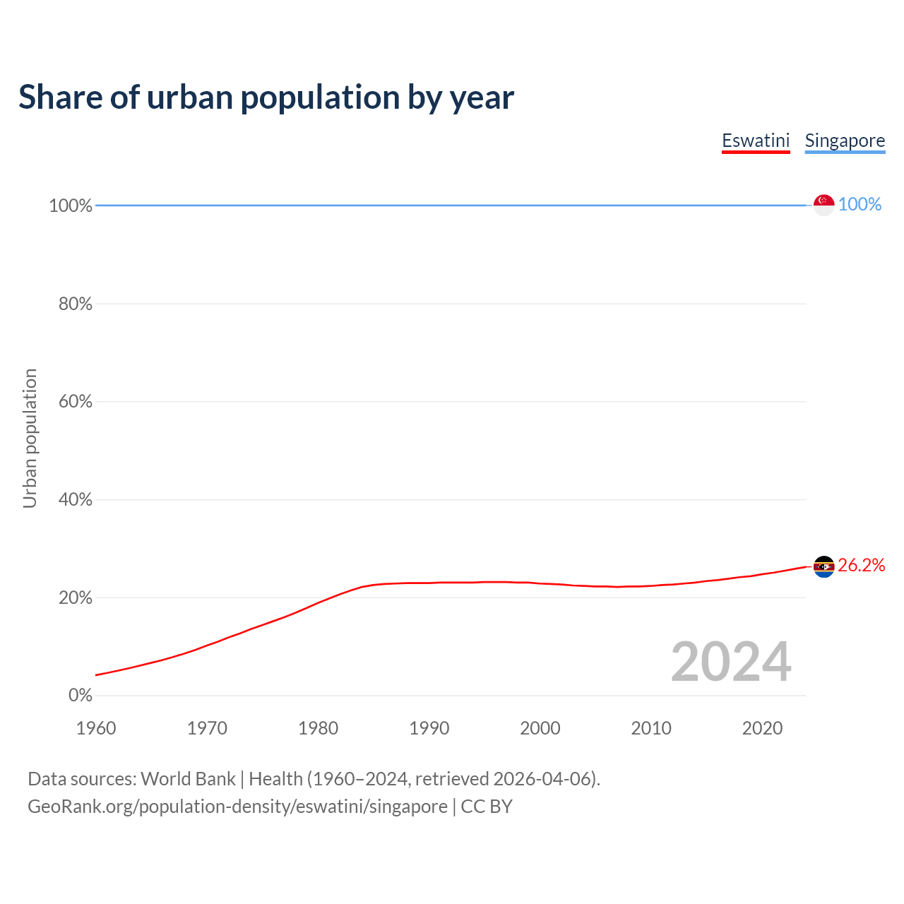 From 2004 to 2024, the share of urban population changed from 22.3% to 26.2% in Eswatini and from 100% to 100% in Singapore.
