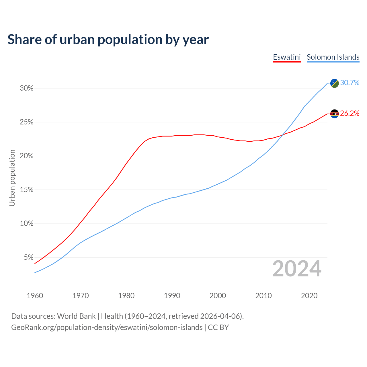 From 2004 to 2024, the share of urban population changed from 22.3% to 26.2% in Eswatini and from 17.2% to 30.7% in the Solomon Islands.