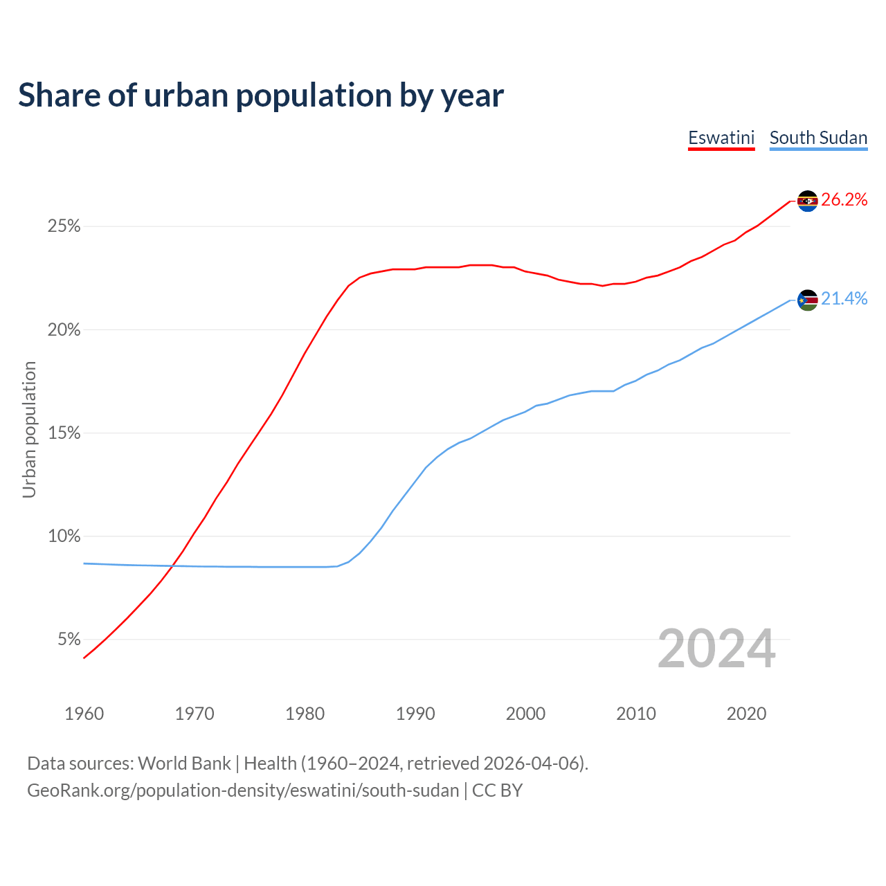 From 2004 to 2024, the share of urban population changed from 22.3% to 26.2% in Eswatini and from 16.8% to 21.4% in South Sudan.