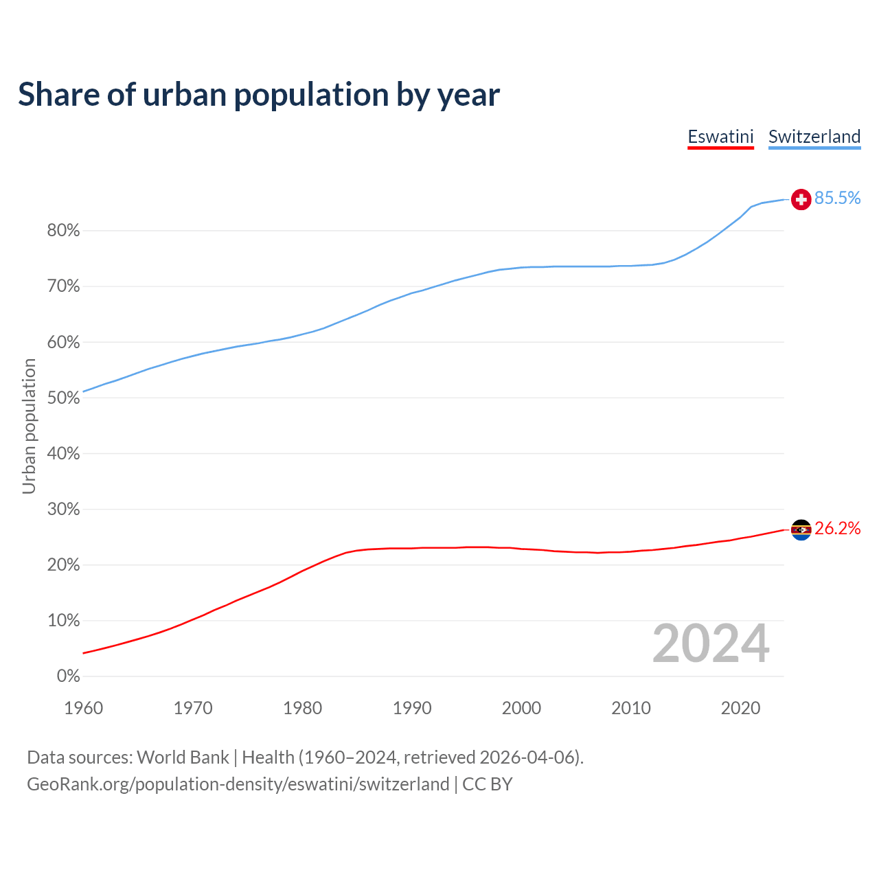 From 2004 to 2024, the share of urban population changed from 22.3% to 26.2% in Eswatini and from 73.5% to 85.5% in Switzerland.