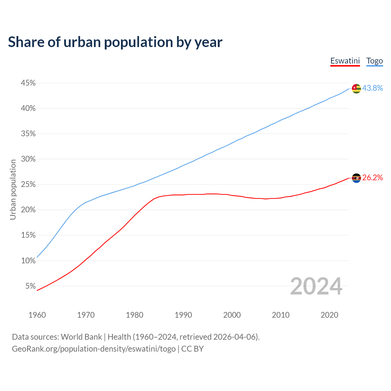 From 2004 to 2024, the share of urban population changed from 22.3% to 26.2% in Eswatini and from 34.9% to 43.8% in Togo.