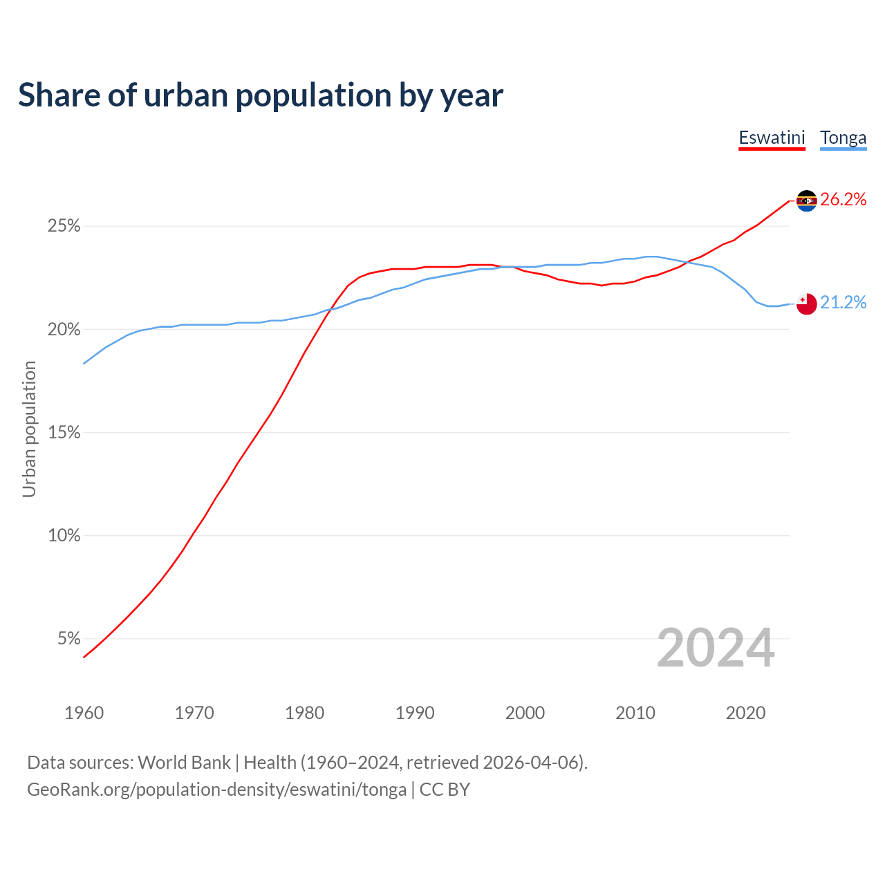 From 2004 to 2024, the share of urban population changed from 22.3% to 26.2% in Eswatini and from 23.1% to 21.2% in Tonga.