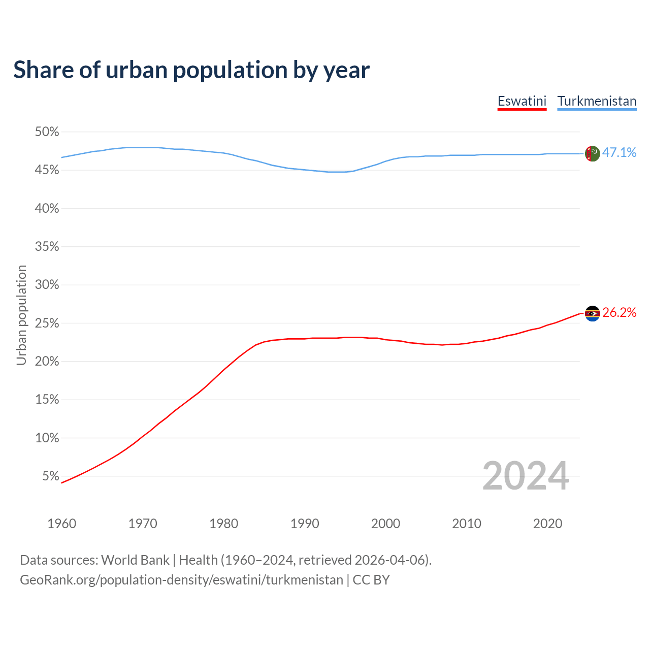 From 2004 to 2024, the share of urban population changed from 22.3% to 26.2% in Eswatini and from 46.7% to 47.1% in Turkmenistan.