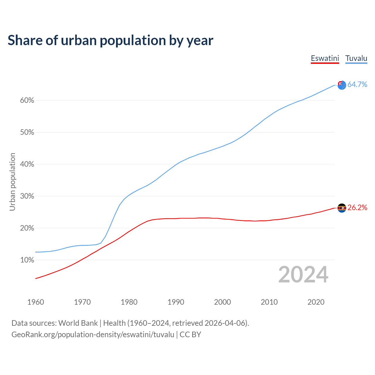 From 2004 to 2024, the share of urban population changed from 22.3% to 26.2% in Eswatini and from 48.4% to 64.7% in Tuvalu.