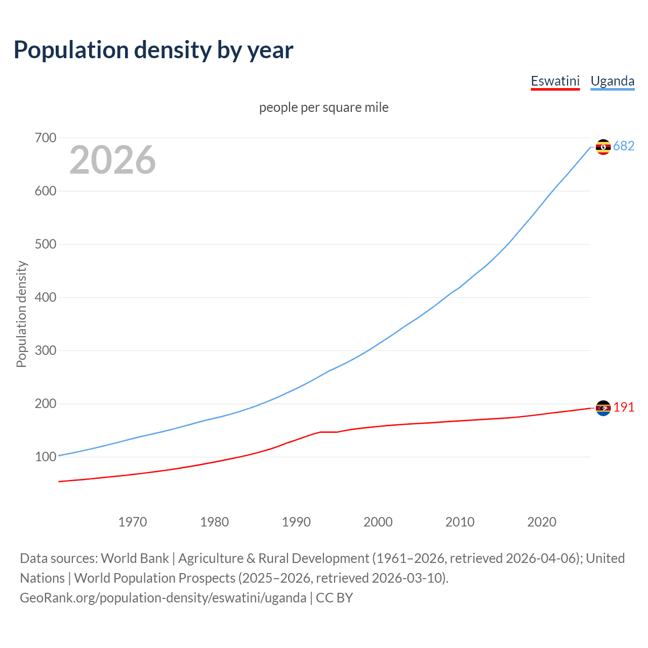 From 2006 to 2026, population density in Eswatini increased by 17.1%, compared to a 82.7% growth in Uganda.