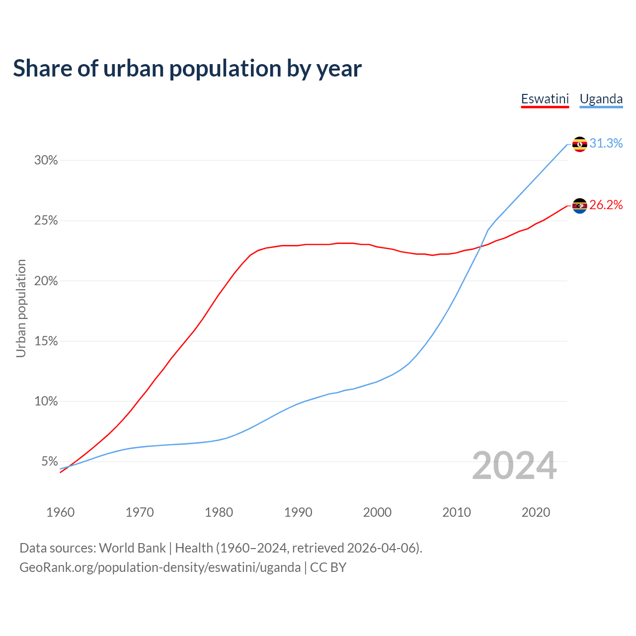 From 2004 to 2024, the share of urban population changed from 22.3% to 26.2% in Eswatini and from 13.1% to 31.3% in Uganda.